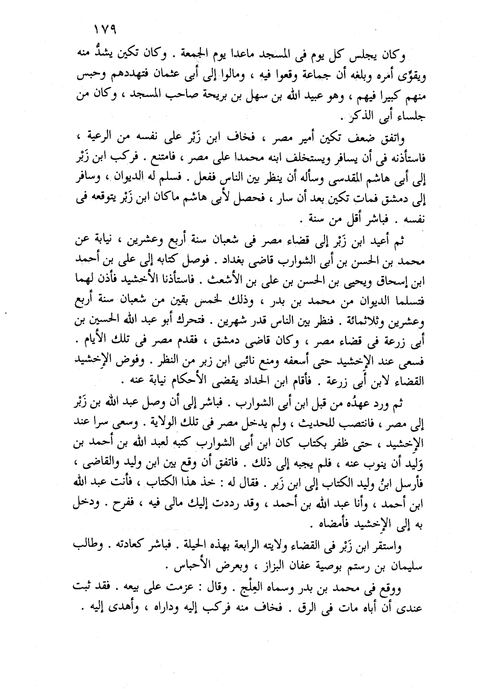ثم ورد عهده من قبل ابن أبي الشوارب، فباشر إلى أن وصل عبد الله بن زبر غل مصر، فانتصب للحديث، ولم يدخل في تلك مصر في تلك الولاية، وسعى سراً عند الإخشيد، حتى ظفر بكتاب كان ابن أبي الشوارب كتبه لعبد الله بن أحمد بن وليد أن ينوب عنه، فلم يجبه إلى ذلك، فاتفق أن وقع بين ابن وليد والقاضي، فأرسل ابن وليد الكتاب إلى ابن زبر، فقال له: خذ هذا الكتاب، فأنت عبد الله بن أحمد، وأنا عبد الله بن أحمد، وقد رددت إليك مالي فيه، ففرح. ودخل به الإخشيد فأمضاه.