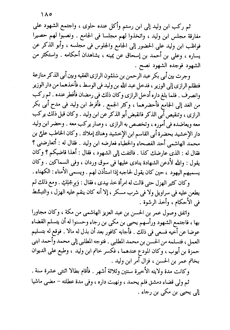 ثم ركب ابن وليد إلى ابن رستم وأكل عنده حلوى، واجتمع الشهود على مفارقة مجلس ابن وليد، واتخذوا لهم مجلساً في الجامع. ونصبوا لهم حصيراً فواظب ابن الوليد على الحضور إلى الجامع والجلوس في مجلسه، وأبو الذكر عن يساره، وعلى بن أحمد بن إسحاق عن يمينه، يشاهدان أحكامه. واستكثر من الشهود فوجده الشهود نصح.