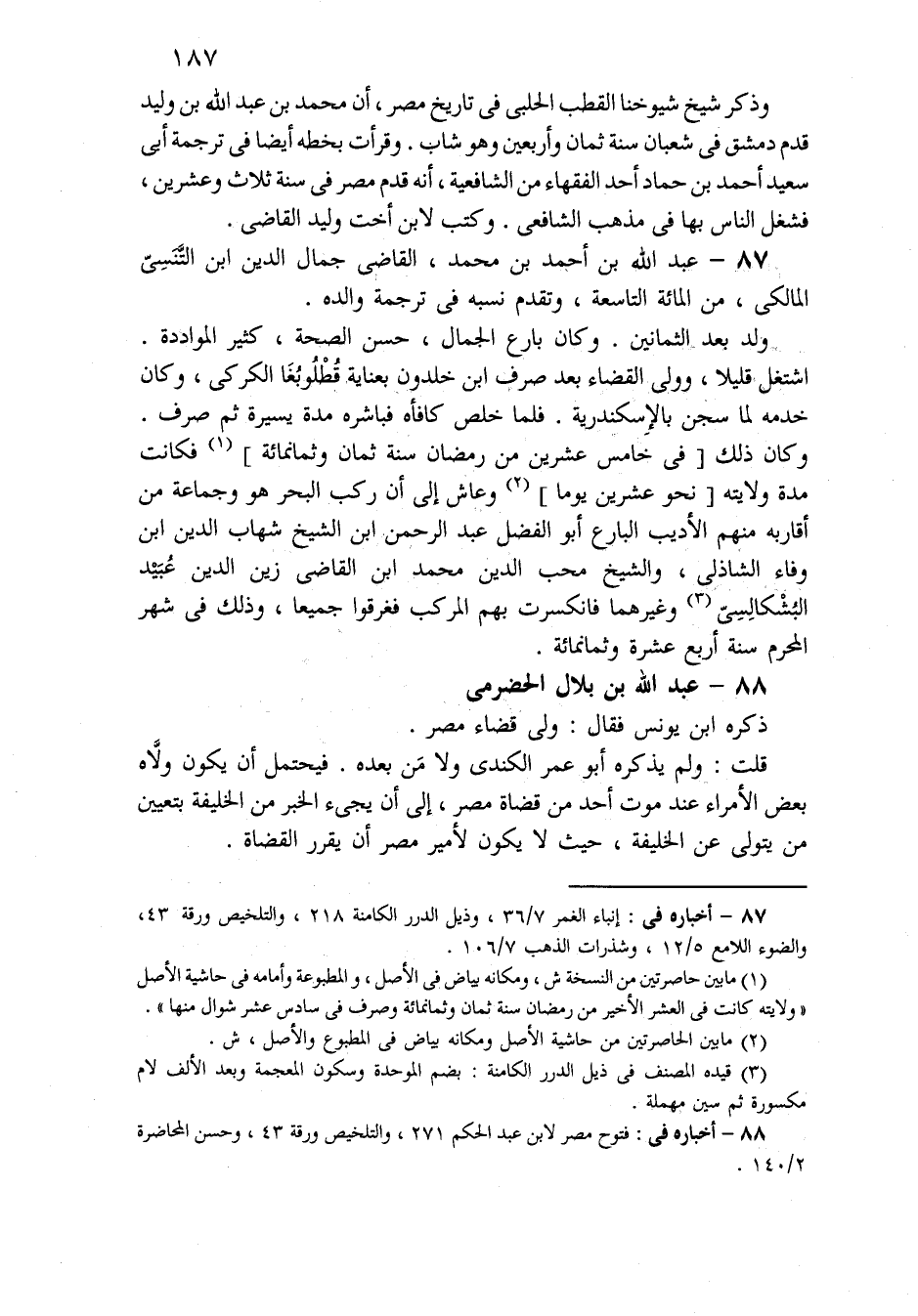 قلت: ولم يذكره أبو عمر الكندي ولا مَن بعده. فيحتمل أن يكون ولاه بعض الأمراء عند موت أحد من قضاة مصر، إلى أن يجئ الخبر من الخليفة بتعيين من يتولى عن الخليفة، حيث لا يكون لأمير مصر أن يقرر القضاة.