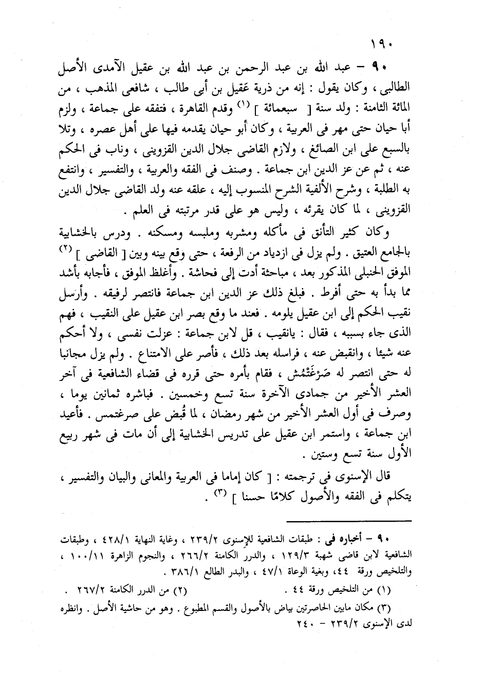 عبد الله بن عبد الرحمن بن عبد الله بن عقيل الآمدي الأصل الطالبي، وكان يقول: إنه من ذرية عَقيل بن أبي طالب، شافي المذهب، من المائة الثامنة: ولد سنة سبعمائة وقدم القاهرة، فتفقه على جماعة، ولزم أبا حيان حتى مهر في العربية، وكان أبو حيان يقدمه فيها على أهل عصره، وتلا بالسبع علي ابن