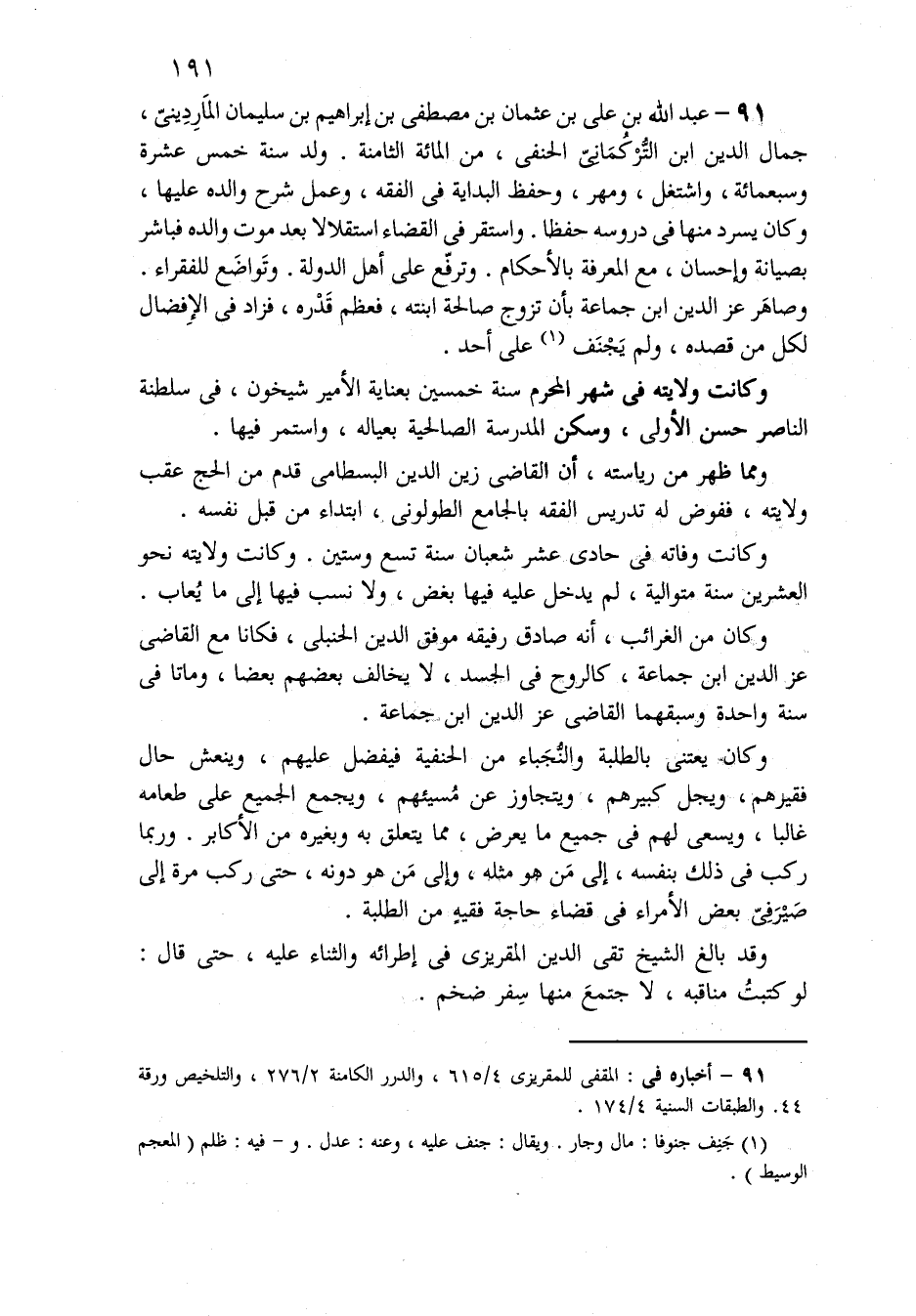 عبد الله بن علي بن عثمان بن مصطفى بن إبراهيم بن سليمان المَارِدِيني، جمال الدين ابن التُّرْكُمَاني الحنفي، من المائة الثامنة. ولد سنة خمس عشرة وسبعمائة، واشتغل، ومهر، وحفظ البداية في الفقه، وعمل شرح والده عليها، وكان يسرد منها في دروسه حفظاً البداية في الفقه، وعمل شرح والده عليها، وكان يسرد منها في دروسه حفظاً. واستقر في القضاء استقلالاً بعد موت والده فباشر بصيانة وإحسان، مع المعرفة بالأحكام. وترفّع على أهل الدولة. وتَواضَع للفقراء. وصاهَر عز الدين ابن جماعة بأن تزوج صالحة ابنته، فعظم قَدْره، فزاد في الإفضال لكل من قصده، ولم يَجْنَف على أحد.