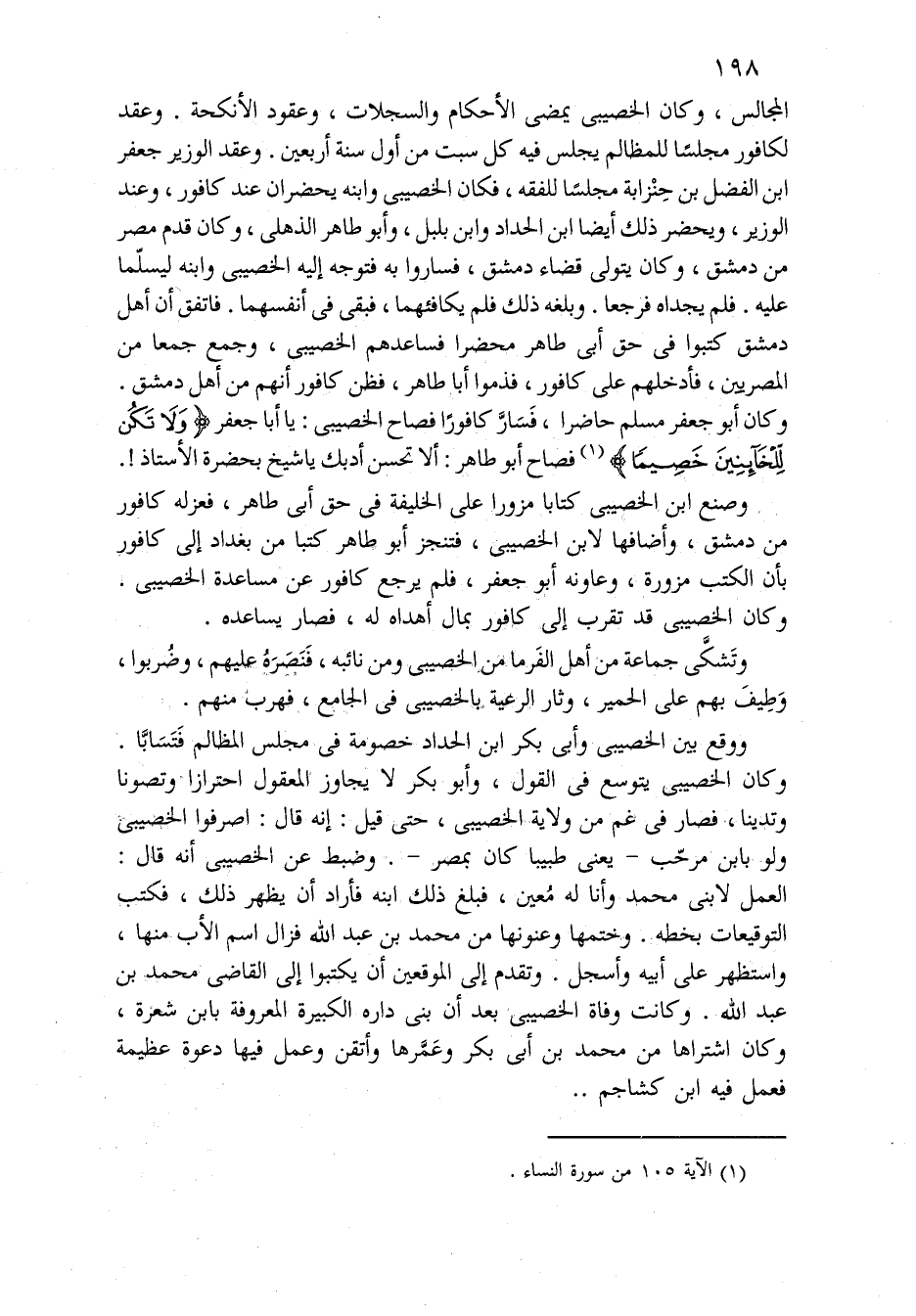 المجالس، وكان الخصيبي يمضي الأحكام والسجلات، وعقود الأنكحة. وعقد لكافور مجلساً للمظالم يجلس فيها كل سبت من أول سنة أربعين. وعقد الوزير جعفر ابن الفضل بن جِنْزابة مجلساً للفقه، فكان الخصيبي وابنه يحضران عند كافور، وعند الوزير، ويحضر ذلك أيضاً ابن الحداد وابن بلبل، وأبو طاهر الذهلي، وكان قدم مصر من دمشق، وكان يتولى قضاء دمشق، فساروا به فتوجه إلى الخصيبي وابنه ليسلّما عليه. فلم يجداه فرجعا. وبلغه ذلك فلم يكافئهما، فبقي في أنفسهما. فاتفق أن أهل دمشق كتبوا في حق أبي طاهر محضراً فساعدهم الخصيبي، وجمع جمعاً من المصريين، أفدخلهم على كافور، فذموا أبا طاهر، فظن كافور