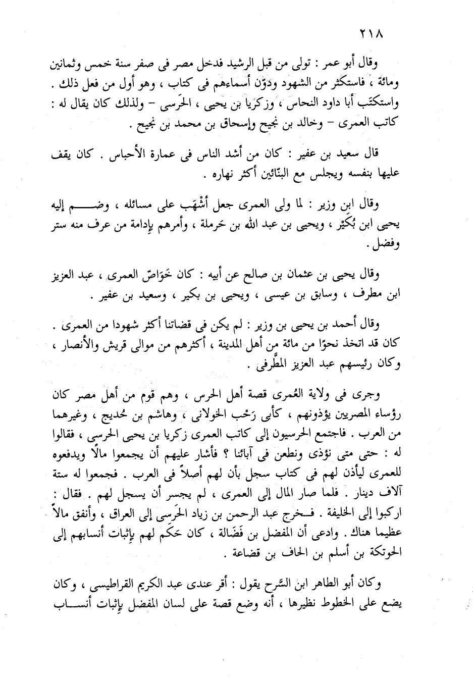 وقال أبو عمر: تولي من قبل الرشيد فدخل مصر في صفر سنة خمس وثمانين ومائة، فاستكثر من الشهود ودوّن أسمائهم في كتاب، وهو أول من فعل ذلك. واستكتَب أبا داود النحاس، وزكريا بن يحيى، الحَرسي - ولذلك كان يقال له: كاتب العمري - وخالد بن نجيح وإسحاق بن محمد بن نجيح.