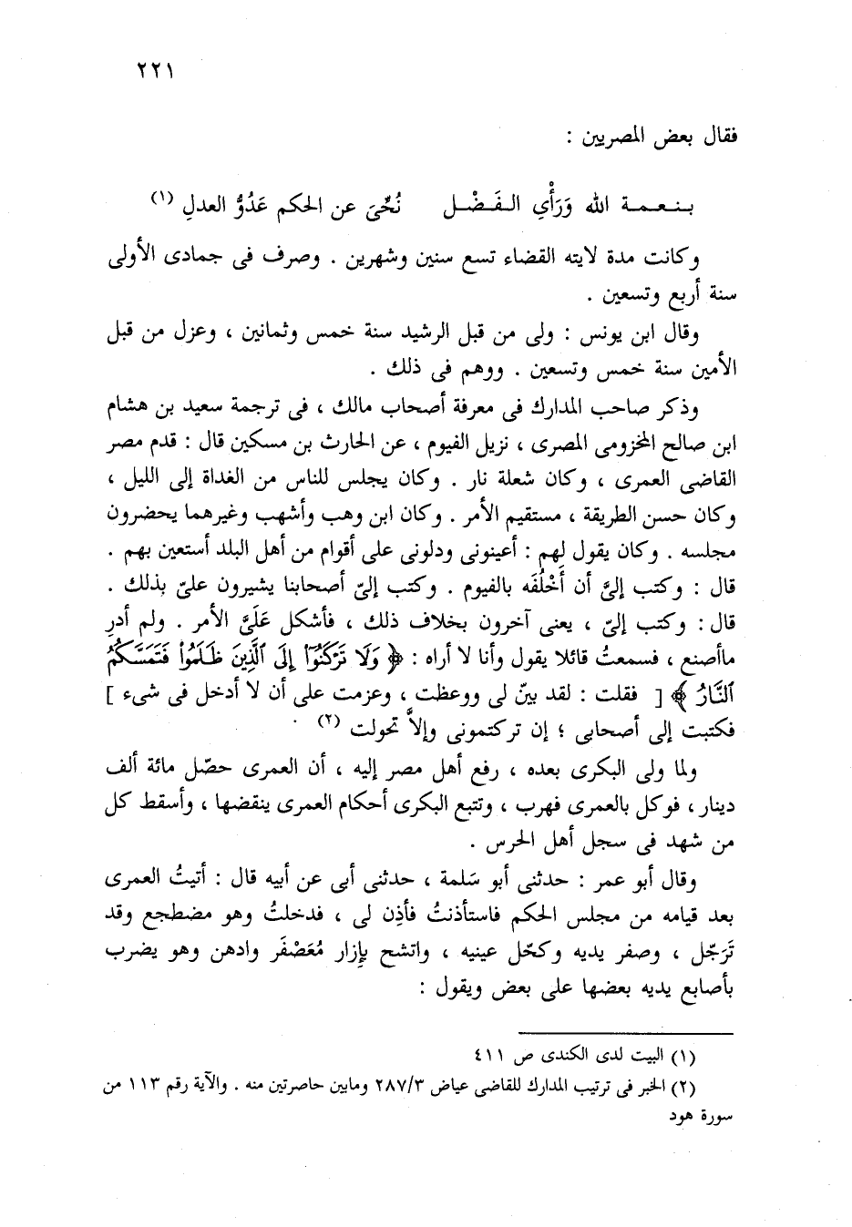 وذكر صاحب المدارك في معرفة أصحاب مالك، في ترجمة سعيد بن هشام ابن صالح المخزومي المصري، نزيل الفيوم، عن الحارث بن مسكين قال: قدم مصر القاضي العمري، وكان شعلة نار. وكان يجلس للناس من الغداة إلى الليل، وكان حسن الطريقة، مستقيم الأمر. وكان ابن وهب وأشهب وغيرهما يحضرون مجلسه. وكان يقول لهم: أعينوني ودلوني على أقوام من أهل البلد أستعين بهم. قال: وكتب إلي أن أَخْلُفَه بالفيوم. وكتب إليّ أصحابنا يشيرون عليّ بذلك. قال: وكتب إلي، يعني آخرون بخلاف ذلك، فأشكل عَلَي الأمر. ولم أدرِ