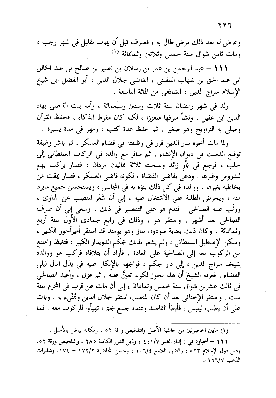 شوال سنة خمس وثمانمائة، وإلى أن مات عن قرب في المحرم سنة ست. واستقر الإخنائي بعد أن كان المنصب استقر طلال الدين وهُنِّئ به. وبات على أن يطلب ليلبس، فأبطأ القاصد وعنده جمع جَمّ، تهيأوا للركوب معه. فما