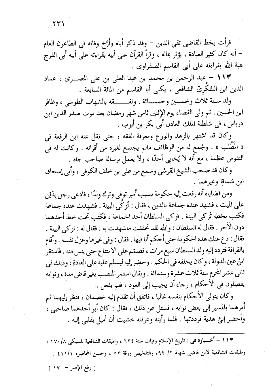 نفسه. وأقام بالقرافة فتردد إِلَيْهِ ولد السلطان سبع مرات، فصمّم عَلَى الامتناع حَتَّى يئس منه. فاستقر ابنُ عين الدولة، وَكَانَ يخلفه فِي الحكم. وحضر إِلَيْهِ ليسلم عَلَيْهِ عَلَى العادة، وذلك فِي ثاني عشر المحرم سنة ثلاث عشرة وستمائة. ويقال استمر المنصب بغير قاض مدة، ونوابه يفصلون فِي الأحكام، رجاء أن يجب إِلَى العود، فلم يفعل.