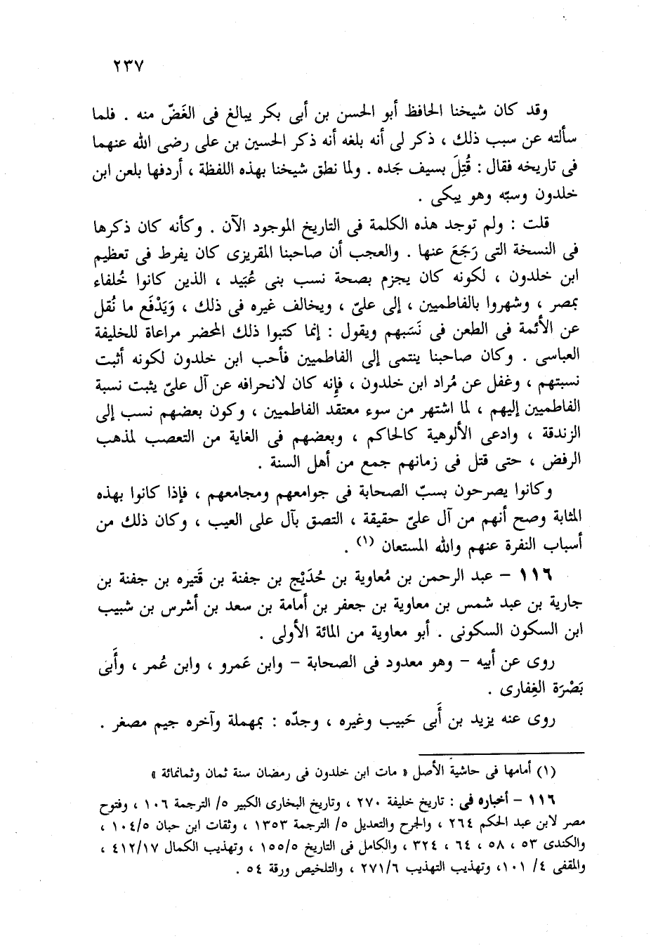 قلت: وَلَمْ توجد هَذِهِ الكلمة فِي التاريخ الموجود الآن. وكأنه كَانَ ذكرها فِي النسخة الَّتِي رَجَعَ عنها. والعجب أن صاحبنا المقريزي كَانَ يفرط فِي تعظيم ابن خلدون، لكونه كَانَ يجزم بصحة نسب بني عُبَيد، الذين كانوا خُلفاء بمصر، وشهروا بالفاطميين،