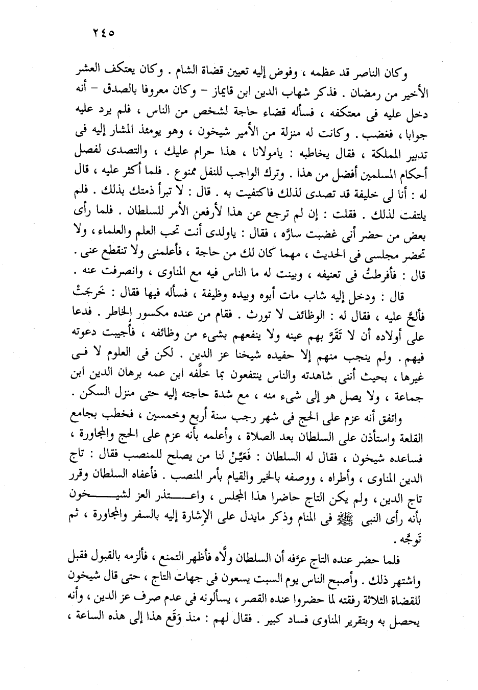 وكان الناصر قَدْ عظمه، وفوض إِلَيْهِ تعيين قضاة الشام. وَكَانَ يعتكف العشر الأخير من رمضان. فذكر شهاب الدين ابن قايماز - وَكَانَ معروفاً بالصدق - أنه دخل عَلَيْهِ فِي معتكفه، فسأله قضاء حاجة لشخص من الناس، فلم يرد عَلَيْهِ جواباً، فغضب. وَكَانَتْ لَهُ منزلة من الأمير شيخون، وهو يومئذ المشار إِلَيْهِ فِي تدبير المملكة، فقال يخاطبه: يَا مولانا، هَذَا حرام عَلَيْكَ، والتصدي لفصل أحكام المسلمين أفضل من هَذَا. وترك الواجب للنفل ممنوع. فلما أكثر عَلَيْهِ، قال لَهُ: أنا لي خليفة قَدْ تصدى لذلك فاكتفيت بِهِ. قال: لا تبرأ ذمتك بذلك. فلم يلتفت لذلك. فقلت: إن لَمْ ترجع عن هَذَا لأرفعن الأمر للسلطان. فلما رأى بعض من حضر أني غضبت سارَّه، فقال: يَا ولدي أنت تحب العلم والفقهاء، ولا تحضر مجلسي فِي الحديث، مَهْمَا كَانَ لَكَ من حاجة، فأعلمني ولا تنقطع عني. قال: فأفرطتُ فِي تعنيفه، وبينت لَهُ مَا الناس فِيهِ مع المناوي، وانصرفت عنه.