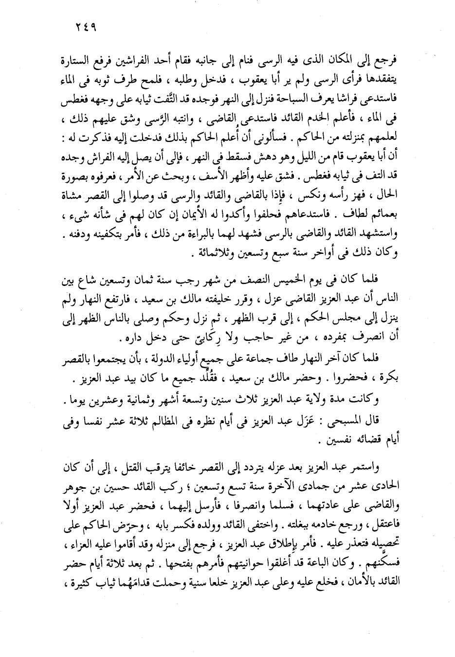 إلى المكان الَّذِي فِيهِ الرسي فنام إِلَى جانبه فقام أحد الفراشين فرفع الستارة يتفقدها فرأى الرسي وَلَمْ ير أبا يعقوب، فدخل وطلبه، فلمح طرف ثوبه فِي الماء فاستدعى فراشاً يعرف السباحة فنزل إِلَى النهر فوجده قَدْ التَّفت ثيابه عَلَى وجهه فغطس فِي الماء، فأعلم الخدم القائد فاستدعى القاضي، وانتبه الرَّسي وشق عليهم ذَلِكَ، لعلمهم بمنزلته من الحاكم. فسألوني أن أَعلم الحاكم بذلك فدخلت إِلَيْهِ فذكرت لَهُ: أن أبا يعقوب قام من الليل وهو دهش فسقط فِي النهر، فإلى أن يصل إِلَيْهِ الفراش وجده قَدْ التف فِي ثيابه فغطس. فشق عَلَيْهِ وأظهر الأسف، وبحث عن الأمر، فعرفوه بصورة الحال، فهز رأسه ونكس، فإِذا بالقاضي والقائد والرسي قَدْ وصلوا إِلَى القصر مشاة بعمائم لطاف. فاستدعاهم فحلفوا وأكدوا لَهُ الأيمان إن كَانَ لَهُم فِي شأنه شيء، واستشهد القائد والقاضي بالرسي فشهد لهما بالبراءة من ذَلِكَ، فأمر بتكفينه ودفنه. وَكَانَ ذَلِكَ فِي أواخر سنة سبع وتسعين وثلاثمائة.
