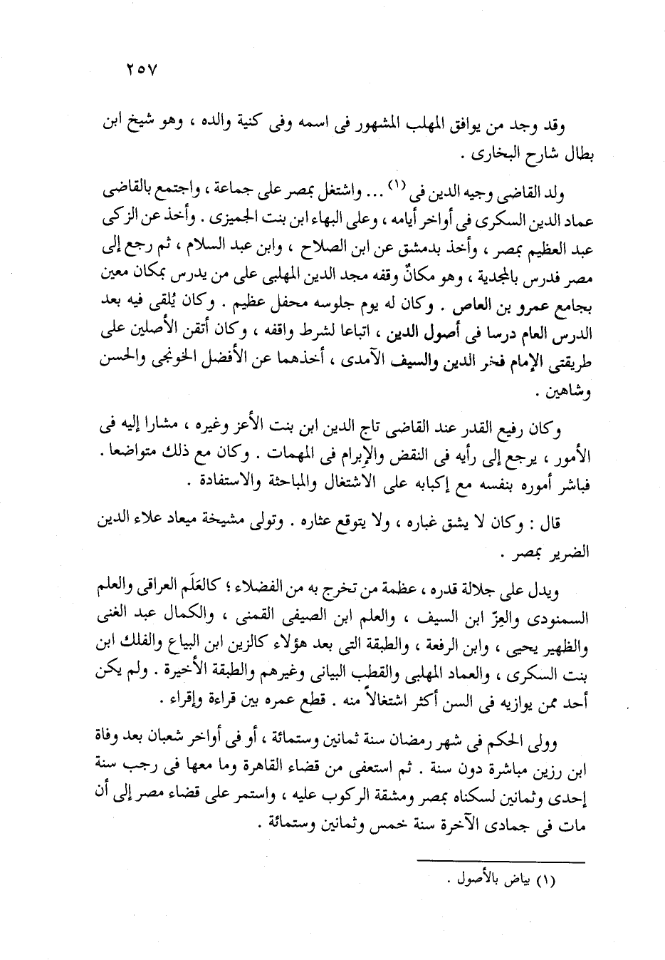 ولد القاضي وجيه الدين فِي ... واشتغل بمصر عَلَى جماعة، واجتمع بالقاضي عناد الدين السكري فِي أواخر أيامه، وَعَلَى البهاء ابن بنت الجميزي. وأخذ عن الزكي عبد العظيم بمصر، وأخذ بدمشق عن ابن الصلاح، وابن عبد السلام، ثُمَّ رجع إِلَى مصر فدرس بالمجدية، وهو مكان وقفه مجد الدين المهلبي عَلَى من يدرس بمكان معين بجامع عمرو بن العاص. وَكَانَ لَهُ يوم جلوسه محفل عظيم. وَكَانَ يُلقى فِيهِ بعد الدرس العام درساً فِي أصول الدين، اتباعاً لشرط واقفه، وَكَانَ أتقن الأصلين عَلَى طريقتي الإمام فخر الدين والسيف الامدي، أخذهما عن الأفضل الخونجي والحسن وشاهين.