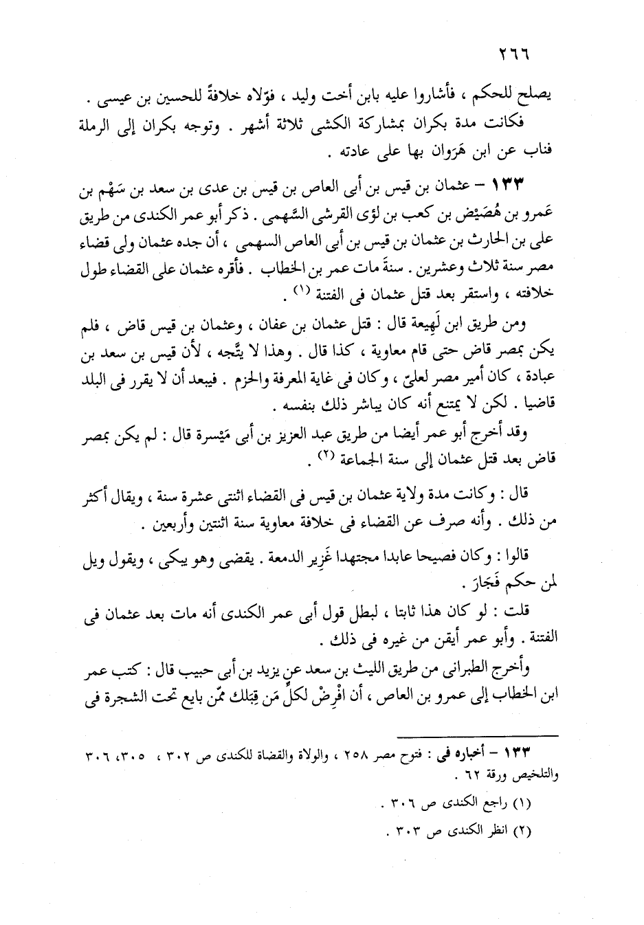 ومن طريق ابن لَهِيعة قال: قتل عثمان بن عفان، وعثمان بن قيس قاض، فلم يكن بمصر قاضٍ حَتَّى قام معاوية، كذا قال: وهذا لا يتَّجه، لأن قيس بن سعد بن عبادة، كَانَ أمير مصر لعليّ، وكان فِي غاية المعرفة والحزم. فيبعد أن لا يقرر فِي البلد قاضياً. لكن لا يمتنع أنه كَانَ يباشر ذلك بنفسه.
