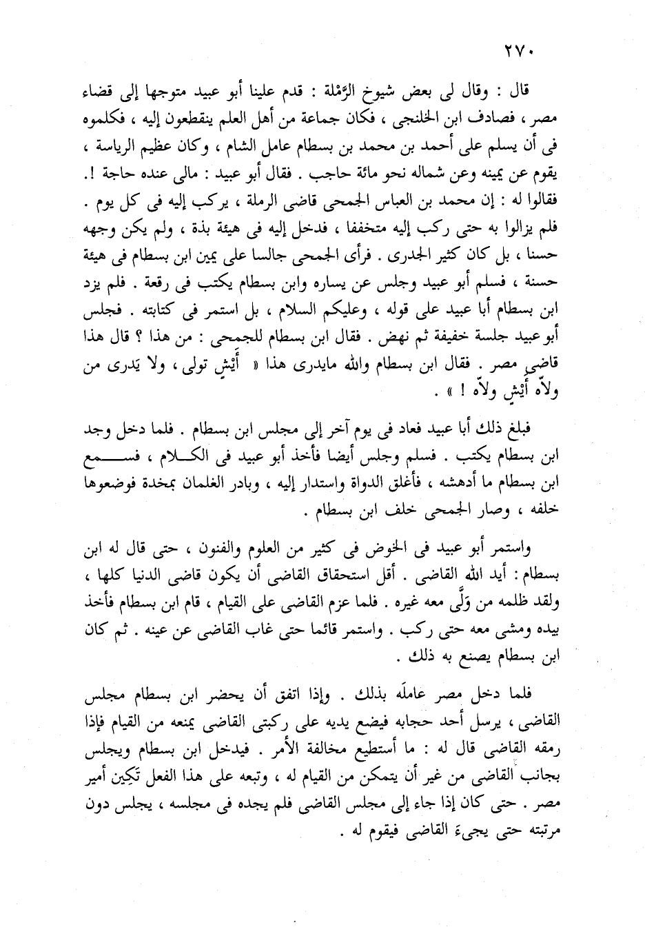قال: وقال لي بعض شيوخ الرَّمْلة: قدم علينا أبو عبيد متوجهاً إِلَى قضاء مصر، فصادف ابن الخلنجي، فكان جماعة من أهل العلم ينقطعون إِلَيْهِ، فكلموه فِي أن يسلم عَلَى أحمد بن محمد بن بسطام عامل الشام، وَكَانَ عظيم الرياسة، يقوم عن يمينه وعن شماله نحو مائة حاجب. فقال أبو عبيد: مَا لي عنده حاجة!. فقالوا لَهُ: إن محمد بن العباس الجمحي قاضي الرملة، يركب إِلَيْهِ فِي كل يوم. فلم يزالوا بِهِ حَتَّى ركب إِلَيْهِ متخففاً، فدخل إِلَيْهِ فِي هيئة بذة، وَلَمْ يكن وجهه حسناً، بل كَانَ كثير الجدري. فرأى الجمحي جالساً عَلَى يمين ابن بسطام فِي هيئة حسنة، فسلم أبو عبيد وجلس عن يساره وابن بسطام يكتب فِي رقعة. فلم يزد ابن بسطام أبا عبيد عَلَى قوله، وعليكم السلام، بل استمر في كتابته. فجلس أبو عبيد جلسة خفيفة ثُمَّ نهض. فقال ابن بسطام للجمحي: من هَذَا؟ قال هَذَا قاضي مصر. فقال ابن بسطام والله مَا يدري هَذَا (أَيْشٍ تولى، ولا يَدري من ولاّه أَيْشٍ ولاّه!) .