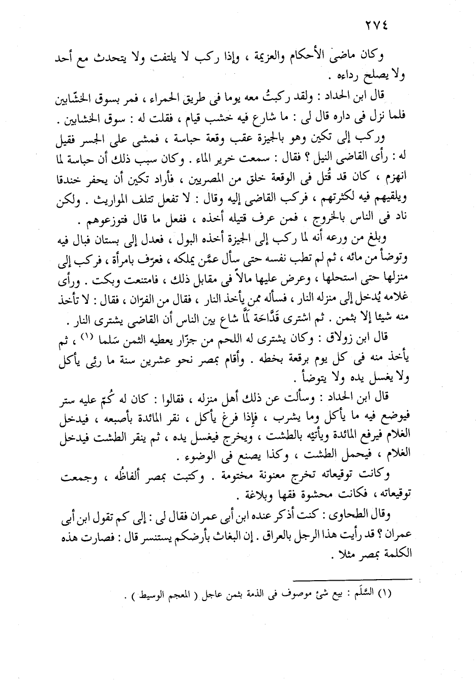 قال ابن زولاق: وَكَانَ يشتري لَهُ اللحم من جزّار يعطيه الثمن سَلماً، ثُمَّ يأخذ منه فِي كل يوم برقعة بخطه. وأقام بمصر نحو عشرين سنة مَا رئِي يأكل ولا يغسل يده ولا يتوضأ.