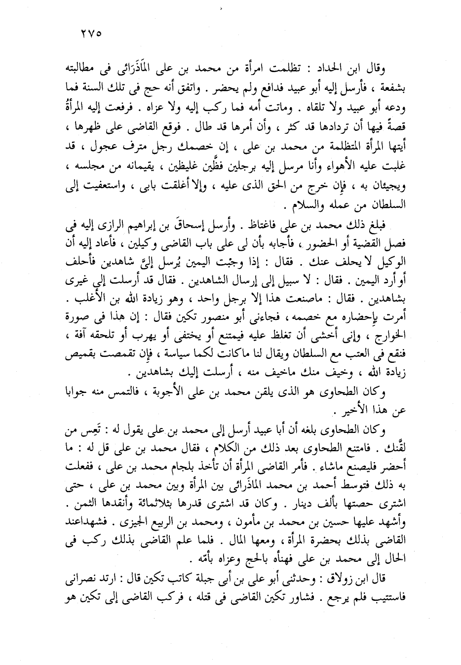 وَكَانَ الطحاوي بلغه أن أبا عبيد أرسل إِلَى محمد بن علي يقول لَهُ: تَعِس من لقَّنك. فامتنع الطحاوي بعد ذَلِكَ من الكلام، فقال محمد بن علي قل لَهُ: مَا أحضر فليصنع مَا شاء. فأمر القاضي المرأة أن تأخذ بلجام محمد بن علي، ففعلت بِهِ ذَلِكَ فتوسط أحمد بن محمد الماذَرائي بَيْنَ المرأة وبين محمد بن علي، حَتَّى اشترى حصتها بألف دينار. وَكَانَ قد اشترى قدرها بثلاثمائة وأنقدها الثمن. وأشهد عَلَيْهَا حسين بن محمد بن مأمون، ومحمد بن الربيع الجيزي. فشهدا عند القاضي بذلك بحضرة المرأة، ومعها المال. فلما علم القاضي بذلك ركب فِي الحال إلى محمد بن علي فهنأه بالحج وعزاه بأمّه.