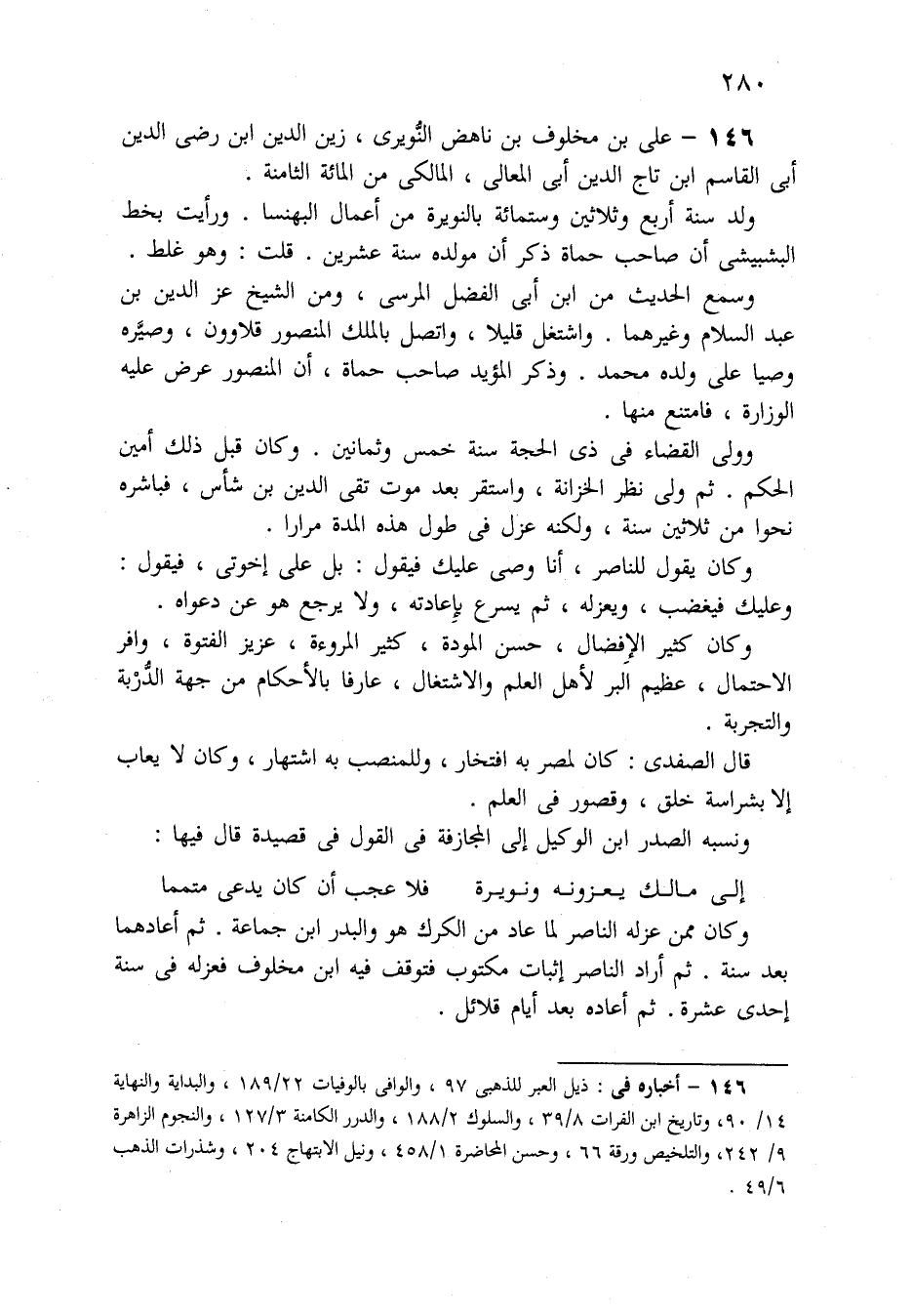 وَكَانَ ممن عزله الناصر لما عاد من الكرك هو والبدر ابن جماعة. ثُمَّ أعادهما بعد سنة. ثُمَّ أراد الناصر إثبات مكتوب فتوقف فِيهِ ابن مخلوف فعزله فِي سنة إحدى عشرة. ثُمَّ أعاده بعد أيام قلائل.
