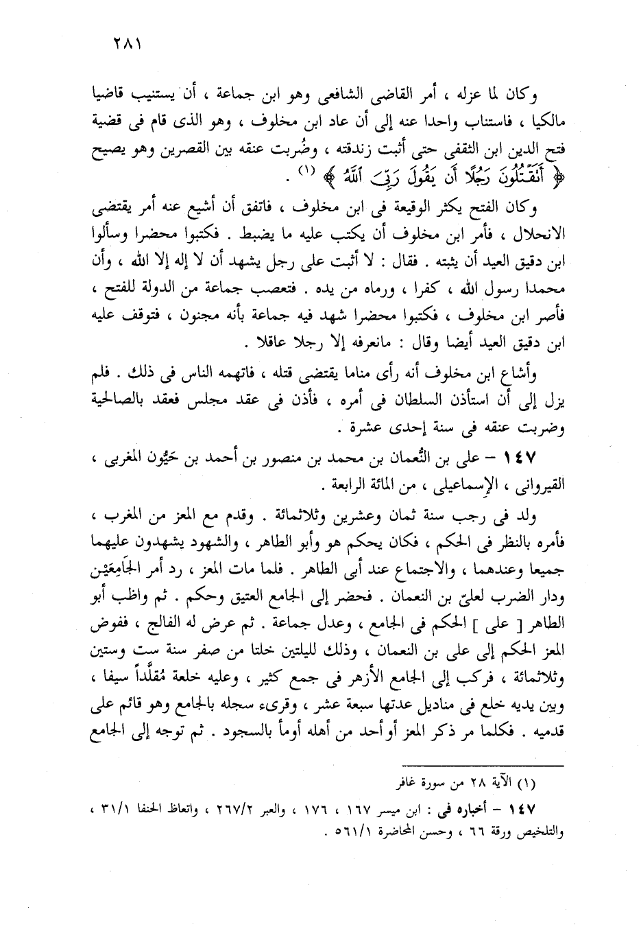 وَكَانَ الفتح يكثر الوقيعة فِي ابن مخلوف، فاتفق أن أشيع عنه أمر يقتضي الانحلال، فأمر ابن مخلوف أن يكتب عَلَيْهِ مَا يضبط. فكتبوا محضراً وسألوا ابن دقيق العيد أن يثبته. فقال: لا أثبت عَلَى رجل يشهد أن لا إله إِلاَّ الله، وأن محمداً رسول الله، كفراً، ورماه من يده. فتعصب جماعة من الدولة للفتح، فأصر ابن مخلوف، فكتبوا محضراً شهد فِيهِ جماعة بأنه مجنون، فتوقف عَلَيْهِ ابن دقيق العيد أيضاً وقال: مَا نعرفه إِلاَّ رجلاً عاقلاً.