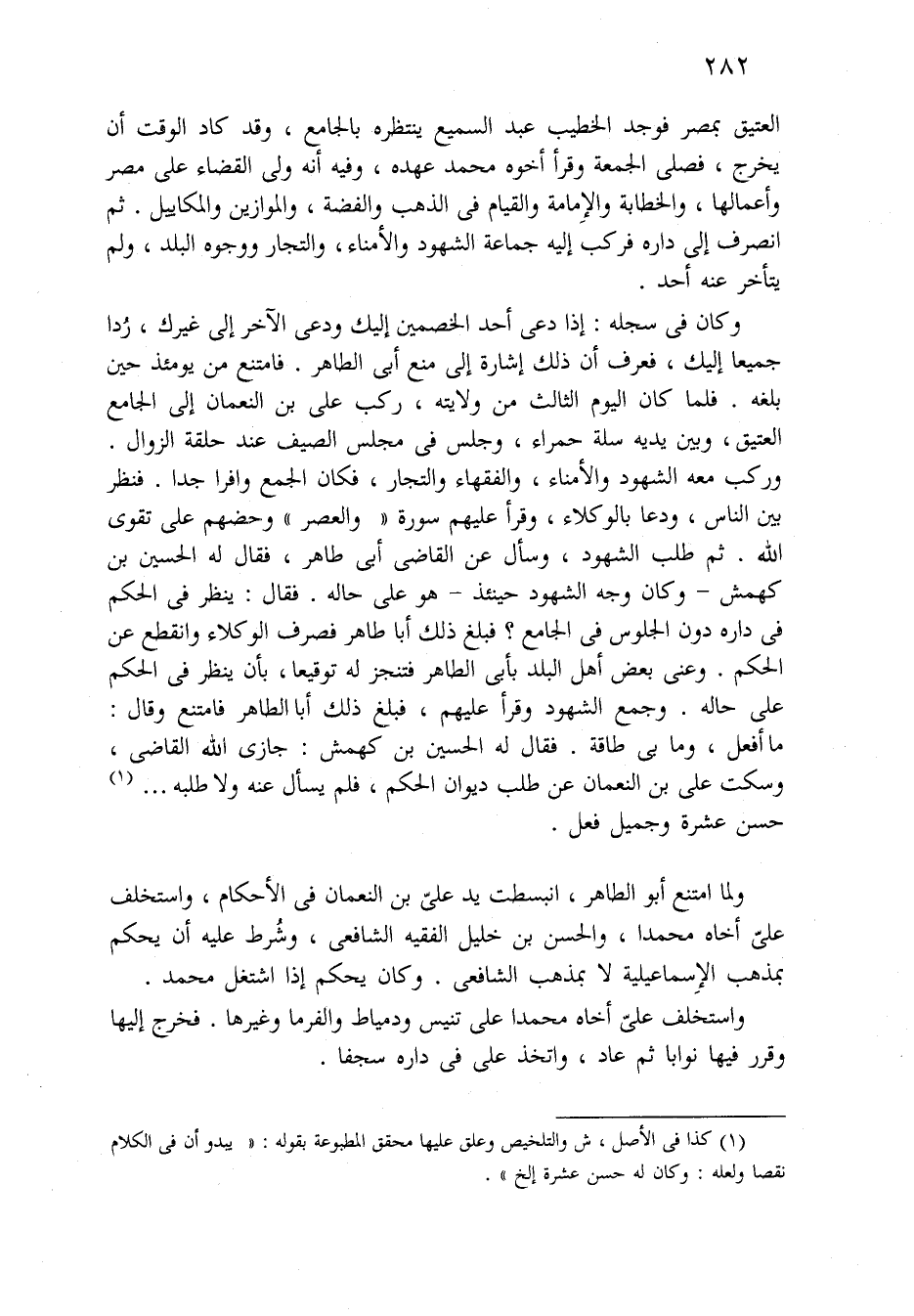 وكان فِي سجله: إِذَا دعي أحد الخصمين إِلَيْكَ ودعي الآخر إِلَى غيرك، رُدا جميعاً إِلَيْكَ، فعرف أن ذَلِكَ إشارة إِلَى منع أبي الطاهر. فامتنع من يومئذ حين بلغه. فلما كَانَ اليوم الثالث من ولايته، ركب علي بن النعمان إِلَى الجامع العتيق، وبين يديه سلة حمراء، وجلس فِي مجلس الصيف عند حلقة الزوال. وركب معه الشهود والأمناء، والفقهاء والتجار، فكان الجمع وافراً جداً. فنظر بَيْنَ الناس، ودعا بالوكلاء، وقرأ عليهم سورة (والعصر) وحضهم عَلَى تقوى الله. ثُمَّ طلب الشهود، وسأل عن القاضي أبي طاهر، فقال لَهُ الحسين بن كهمش - وَكَانَ وجه الشهود حينئذ - هو عَلَى حاله. فقال: ينظر فِي الحكم فِي داره دون الجلوس فِي الجامع؟ فبلغ ذَلِكَ أبا طاهر فصرف الوكلاء وانقطع عن الحكم. وعني بعض أهل البلد بأبي الطاهر فتنجز لَهُ توقيعاً، بأن ينظر فِي الحكم عَلَى حاله. وجمع الشهود وقرأ عليهم، بلغ ذَلِكَ أبا الطاهر فامتنع وقال: مَا أفعل، وَمَا بي طاقة. فقال لَهُ الحسين بن كهمش: جازى الله القاضي، وسكت علي بن النعمان عن طلب ديوان الحكم، فلم يسأل عنه ولا طلبه ... حسن عشرة وجميل فعل.