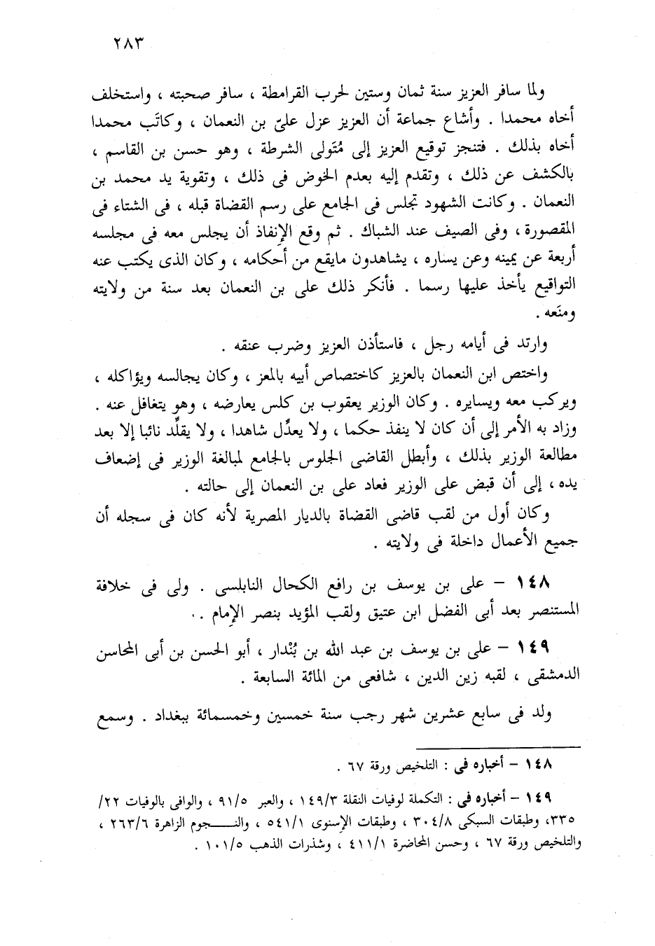 واختص ابن النعمان بالعزيز كاختصاص أبيه المعز، وَكَانَ يجالسه ويؤاكله، ويركب معه ويسايره وَكَانَ الوزير يعقوب بن كلس يعارضه، وهو يتغافل عنه. وزاد بِهِ الأمر إِلَى أن كَانَ لا ينفذ حكماً، ولا يعدِّل شاهداً، ولا يقلِّد نائباً إِلاَّ بعد مطالعة الوزير بذلك، وأبطل القاضي الجلوس لمبالغة الوزير فِي إضعاف يده، إِلَى أن قبض عَلَى الوزير فعاد علي بن النعمان إِلَى حالته.