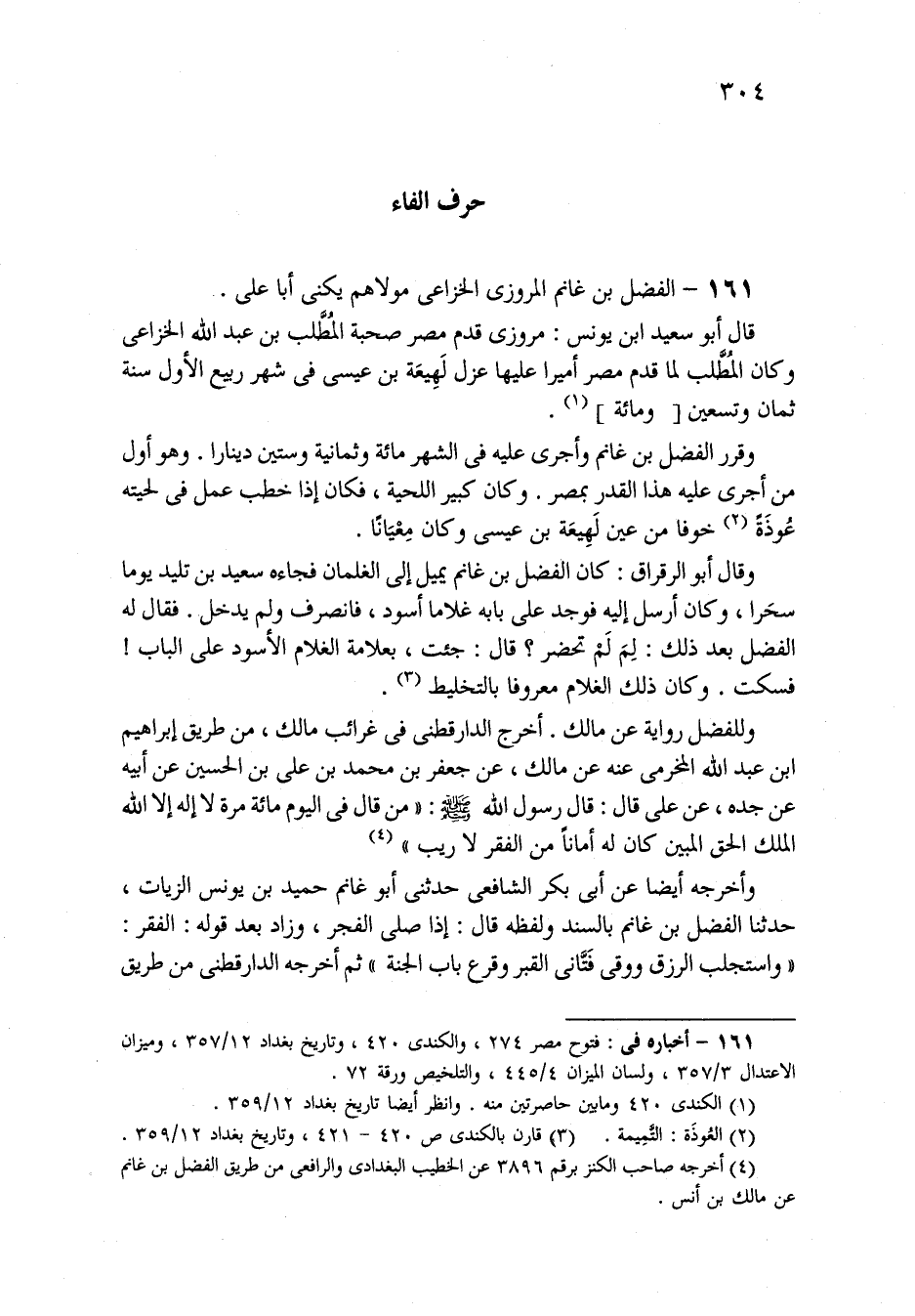 وللفضل رواية عن مالك. أخرجا لدارقطني في غرائب مالك، من طريق إبراهيم ابن عبد الله المخرمي عنه عن مالك، عن جعفر بن محمد بن علي بن الحسين عن أبيه عن جده، عن علي قال: قال رسول الله صلى الله عليه وسلم: " من قال في اليوم مائة مرة لا إله إلا الله الملك الحق المبين كان له أماناً من الفقر لا ريب ".
