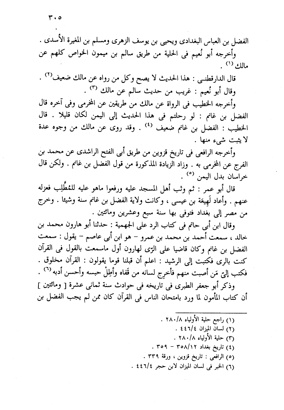 وأخرجه الخطيب في الرواة عن مالك من ريقين عن المخرمي وفي آخره قال الفضل بن غانم: لو رحلتم في هذا الحديث إلى اليمن لكان قليلاً. قال الخطيب: الفضل بن غانم ضعيف. وقد روى عن مالك من وجوه عدة لا يثبت شيء منها.