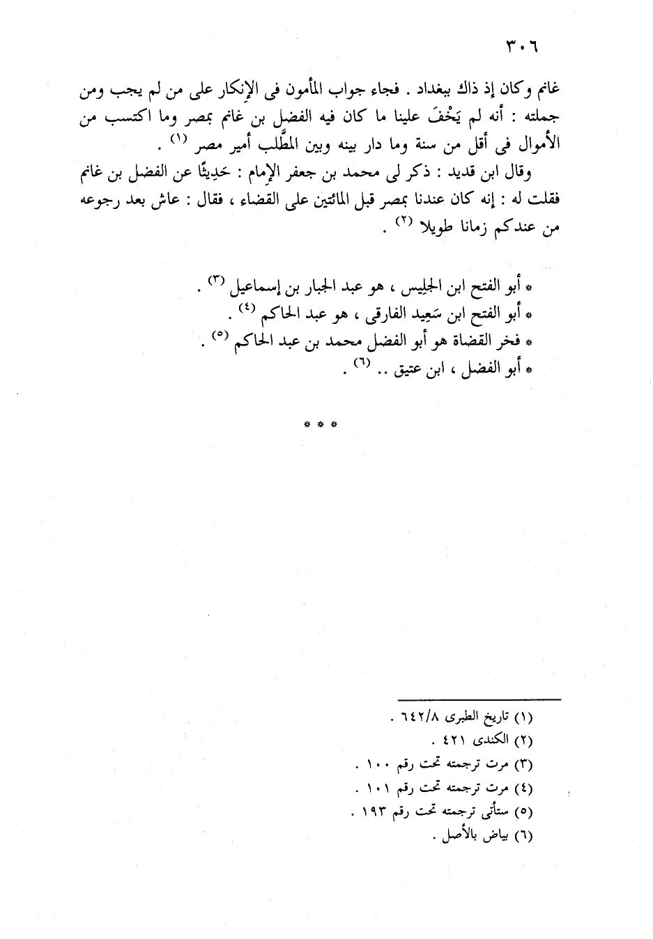 غانم وكان إذ ذاك ببغداد. فجاء جواب المأمون في الإنكار على من لم يجب ومن جملته: أنه لم يَخْفَ علينا ما كان فيه الفضل بن غانم بمصر وما اكتسب من الأموال في أقل من سنة وما دار بينه وبني المطَّلب أمير مصر.
