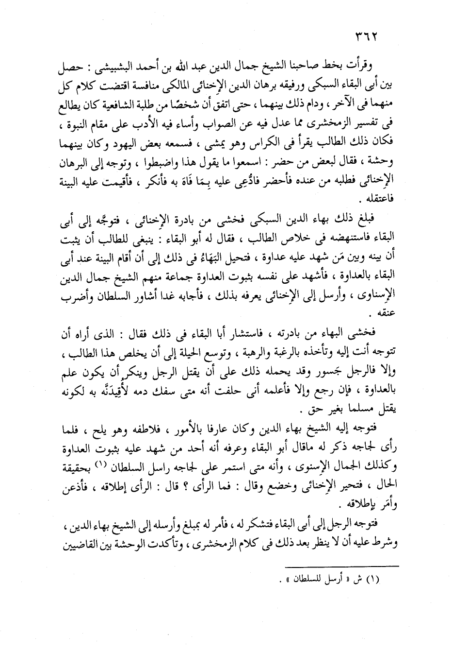 وقرأت بخط صاحبنا الشيخ جمال الدين عبد الله بن أحمد البشبيشي: حصل بَيْنَ أبي البقاء السبكي ورفيقه برهان الدين الإخنائي المالكي منافسة اقتضت كلام كل منهما فِي الآخر، ودام ذلك بينهما، حَتَّى اتفق أن شخصاً من طلبة الشافعية كَانَ يطالع فِي تفسير الزمخشري مما عدل فِيهِ عن الصواب وأساء فِيهِ الأدب عَلَى مقام النبوة، فكان ذَلِكَ الطالب يقرأ فِي الكراس وهو يمشي، فسمعه بعض اليهود وَكَانَ بينهما وحشة، فقال لبعض من حضر: اسمعوا مَا يقول هَذَا واضبطوا، وتوجه إِلَى البرهان الإِخنائي فطلبه من عنده فأحضر فادُّعِي عَلَيْهِ بِمَا فَاة بِهِ فأنكر، فأقيمت عَلَيْهِ البينة فاعتقله.