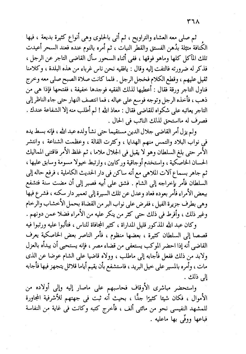ثُمَّ صلى معه العشاء والتراويح، ثُمَّ أتى بالحلوى وهي أنواع كثيرة بديعة، فِيهَا الكُنافة متبّلة بدُهن الفستق والقطر النبات، ثُمَّ أمره بالنوم عنده فعند السحر أعيدت تِلْكَ المآكل كلها وَمَا هو فوقها، ففي أثناء السحور سأل القاضي التاجر عن الرجل، فذكر لَهُ ضرورته فالتفت إِلَيْهِ وقال: يَا فقيه نحن ناس غرباء من هَذِهِ البلدة، وكلامنا ثقيل عليهم، وقطع الكلام فخجل الرجل. فلما كانت صلاة الصبح صلى معه وخرج فناول التاجر ورقة فقال: أعطيها لذلك الفقيه فوجدها خفيفة، ففتحها فإذا هي من ذهب، فأخذه الرجل وتوجه فوسع عَلَى عياله، فما انتصف النهار حتى جاء الناظر إِلَى التاجر يعاتبه عَلَى شكواه للقاضي فقال: معاذ الله! لَمْ أطلب منه إِلاَّ الشفاعة عندك. فصرف لَهُ مَا استحق لذلك النائب فِي الحال.