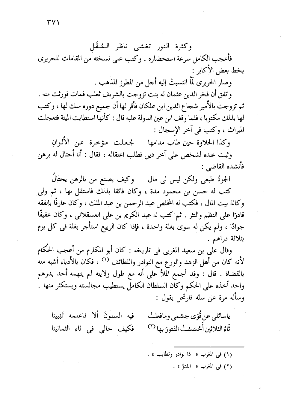 فأعجب الكامل سرعة استحضاره. وكتب عَلَى نسخته من المقامات للحريري بط بعض الأكابر: وصار الحريري لَمَّا انتسبتْ إِلَيْهِ أجل من المطرز المذهب.