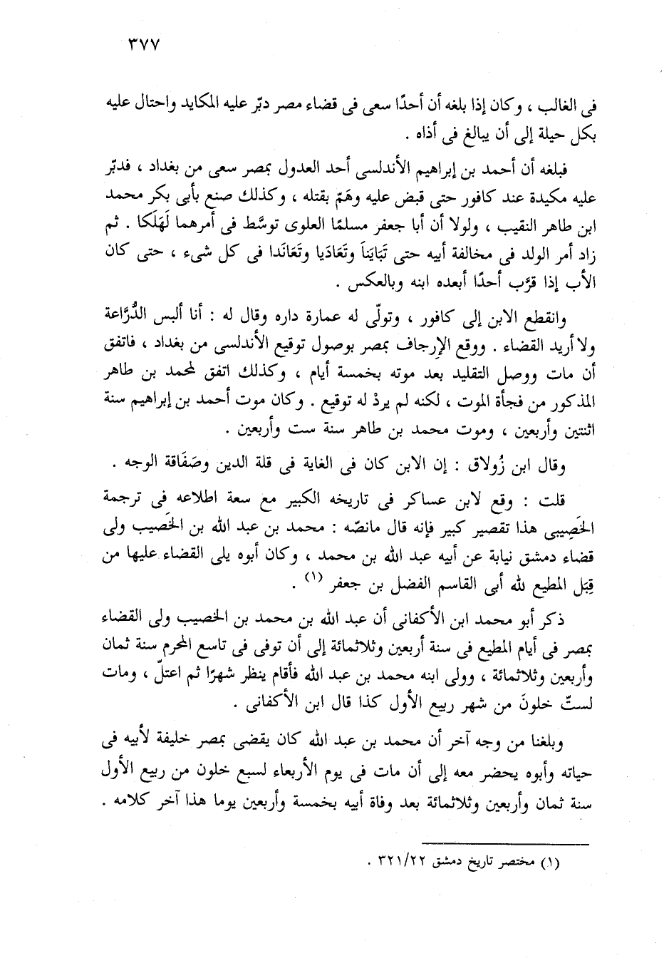 قلت: وقع لابن عساكر فغي تاريخه الكبير مع سعة اطلاعه فِي ترجمة الخَصِيبِيّ هَذَا تقصير كبير فإنه قال مَا نصّه: محمد بن عبد الله بن الخَصيب ولي قضاء دمشق نيابة عن أبيه بن محمد، وَكَانَ أبوه يلي القضاء عَلَيْهَا من قِبَل المطيع لله أبي القاسم الفضل بن جعفر.