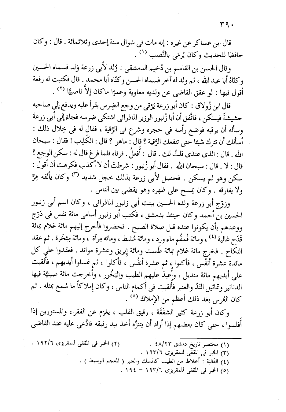 وزوّج أبو زرعة ولده الحسين ببنت أبي زنبور الماذرائي، وَكَانَ اسم أبي زنبور الحسين لن احمد وَكَانَ حينئذ بدمشق، فكتب أبو زنبور أسامي مائة نفس فِي دَرْج ووعدهم بأن يكونوا عنده قبل صلاة الصبح. فحضروا فأخرج إليهم مائة غلام بمائة قَدَح غالية، ومائة قُمقُم ماء ورد، ومائة مُشط، ومائة مِرآة، ومائة مِبْخَرة. ثُمَّ عقد النكاح. فخرج مائة غلام بمائة طَست ومائة إبريق وعشرة موائد. فعقدوا عَلَى كل مائدة عشرة أنفُس، فأكلوا، ثُمَّ عشرة موائد. فعقدوا عَلَى كل مائدة عشرة أنفُس، فأكلوا، ثُمَّ عشرة أنفُس، فأكلوا ثُمَّ غسلوا أيديهم، فأُلقيت عَلَى أيديهم مائة منديل، وأُعيدَ عليهم الطيب والبَخُور، وأُخرجت مائة صينيَّة فِيهَا الدنانير وتماثيل النَّدّ والعنبر فألقيت فِي أكمام الناس، وَكَانَ إِملاكاً مَا سُمع بمثله. ثُمَّ كَانَ العُرس بعد ذَلِكَ أعظم من الإِملاك.