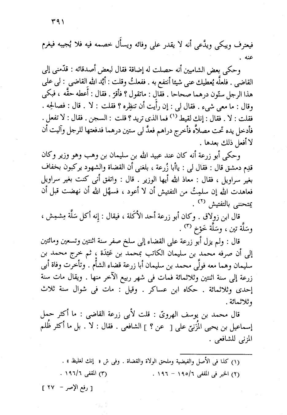 وحكى أبو زرعة أنه كَانَ عند عبيد الله بن سليمان بن وهب وهو وزير وَكَانَ قدِم دمشق قال: فقال لي: يَا أبا زُرعة، بلغني أن القضاة والشهود يركبون بخفاف بغير سراويل، فقال: معاذ الله أَيُّهَا الوزير. قال: واتفق أني كنت بغير سراويل فعاهدت الله إن سلِمتُ من التفتيش أن لا أعود، فسهَّل الله أن نهضت قبل أن يمتحنني بالتفتيش.