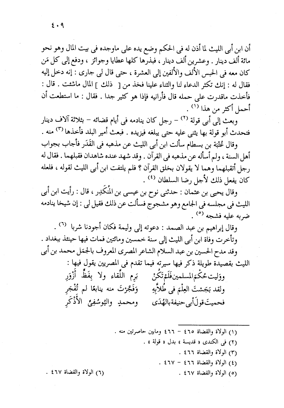 أن ابن أبي الليث لما أذن لَهُ فِي الحكم وضع يده عَلَى مَا وجده فِي بيت المال وهو نحو مائة ألف دينار. وعشرين ألف دينار، فبذرها كلها عطايا وجوائز، ودفع إِلَى كل مَن كَانَ معه فِي الحبس الألف والألفين إِلَى العشرة، حَتَّى قال لي جاري: إنه دخل إِلَيْهِ فقال لَهُ: إنك تكثر الدعاء لَنَا والثناء علينا فخذ من ذَلِكَ المال مَا شئت. قال: فأخذت مَا قدرت عل حمله قال فأرانيه فإذا هو كثير جداً. فقال: مَا استطعت أن أحمل أكثر من هَذَا.