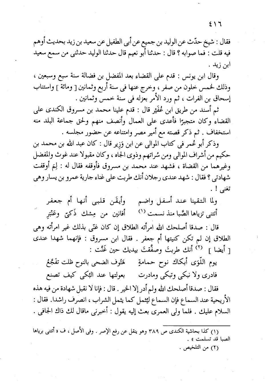 ثم أسند من طريق ابن عُفَيْر قال: قدم علينا محمد بن مسروق الكندي عَلَى القضاء وَكَانَ متجبراً فأعدي عَلَى العمال وأنصف منهم ولحق جماعة البلد منه استخفاف. ثُمَّ ذكر قصته مع أمير مصر وامتناعه عن حضور مجلسه.