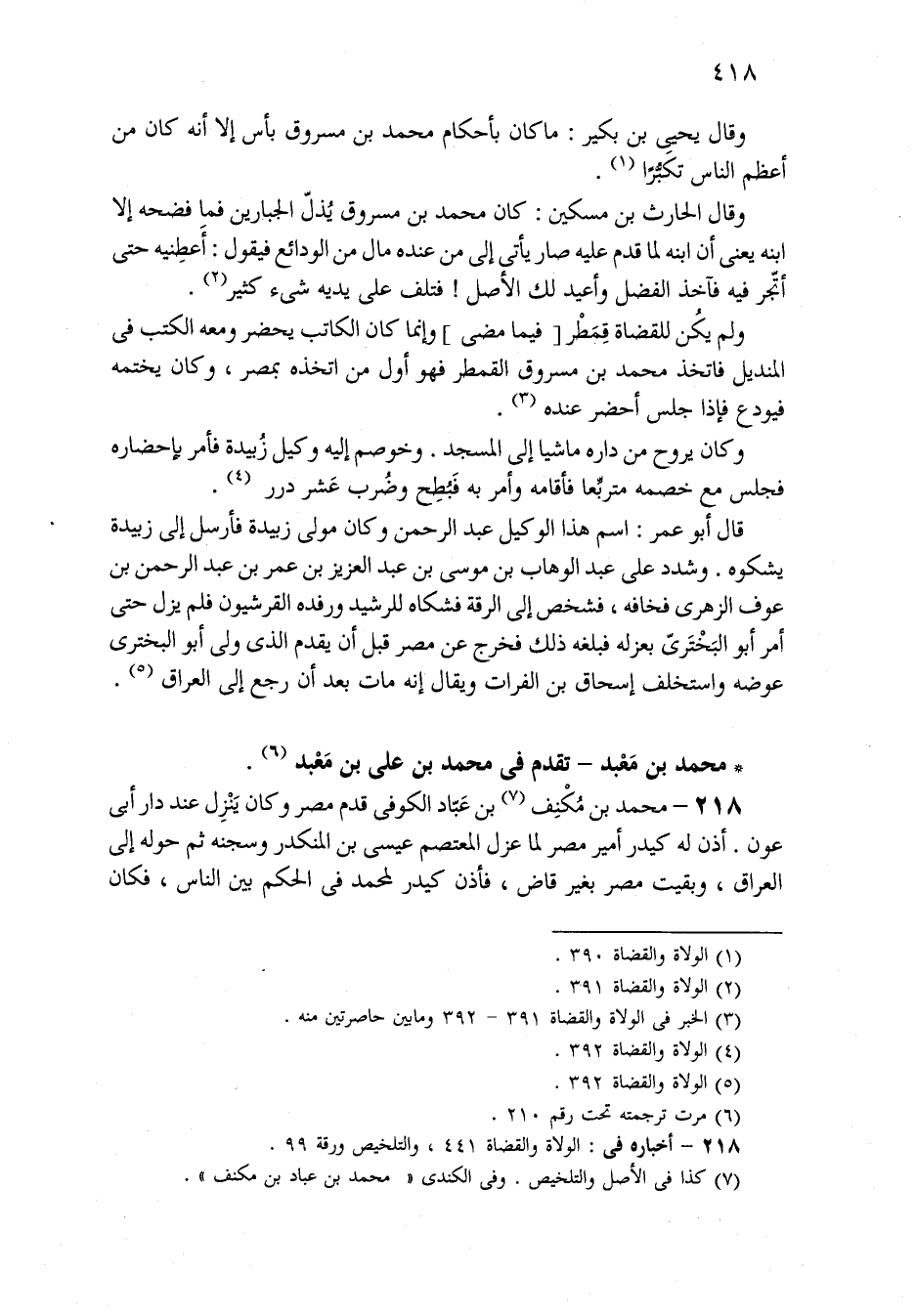 محمد بن مُكْنِف بن عَبّاد الكوفي قدم مصر وَكَانَ يَنْزِل عند دار أبي عون. أذن لَهُ كيدر أمير مصر لما عزل المعتصم عيسى بن المنكدر وسجنه ثُمَّ حوله إِلَى العراق، وبقيت مصر بغير قاضٍ، فأذن كيدر لمحمد فِي الحكم بَيْنَ الناس، فكان