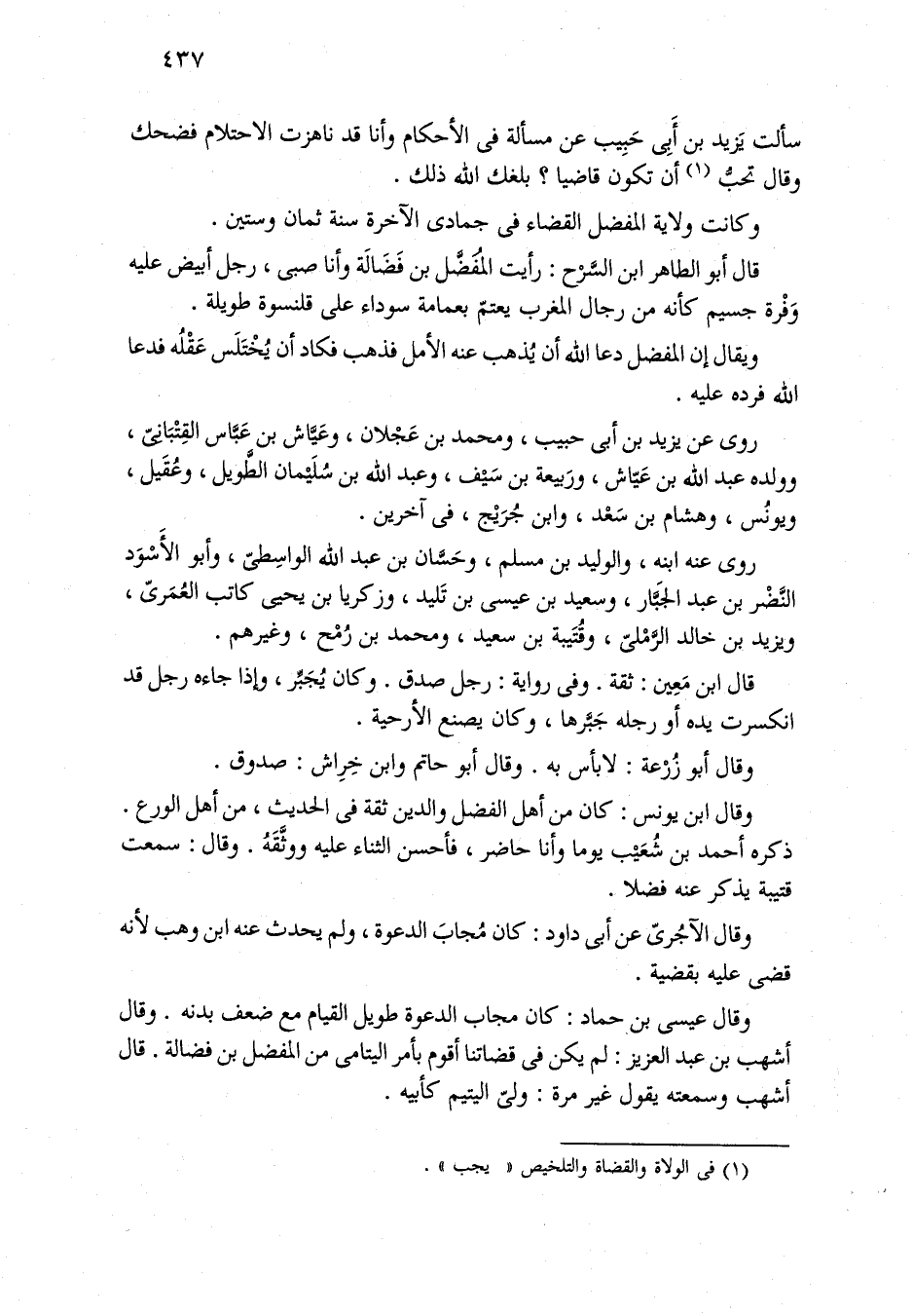 سألت يَزيد بن أَبي حَبيب عن مسألة فِي الأحكام وأنا قَدْ ناهزت الاحتلام فضحك وقال تحبُّ أن تكون قاضياً؟ بلغك الله ذَلِكَ.