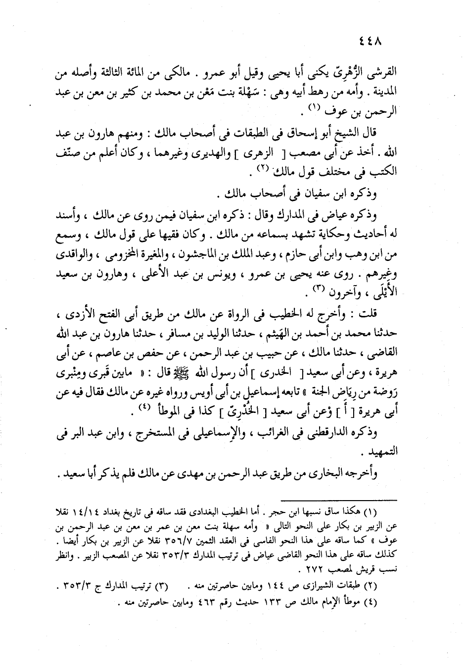 قلت: وأخرج لَهُ الخطيب فِي الرواة عن مالك من طريق أبي الفتح الأزدي، حدثنا محمد بن احمد بن الهَيثم، حدثنا الوليد بن مسافر، حدثنا هارون بن عبد الله القاضي، حدثنا مالك، عن حبيب بن عبد الرحمن، عن حفص بن عاصم، عن أبي هريرة، وعن أبي سعيد الخدري أن رسول الله صلى الله عليه وسلم قال: (مَا بَيْنَ قبري ومِنْبري رَوضة من رِياضِ الجنة) تابعه إسماعيل بن أبي أويس ورواه غيره عن مالك فقال فِيهِ عن أبي هريرة أو عن أبي سعيد الخُدْرِيّ كذا فِي الموطأ.