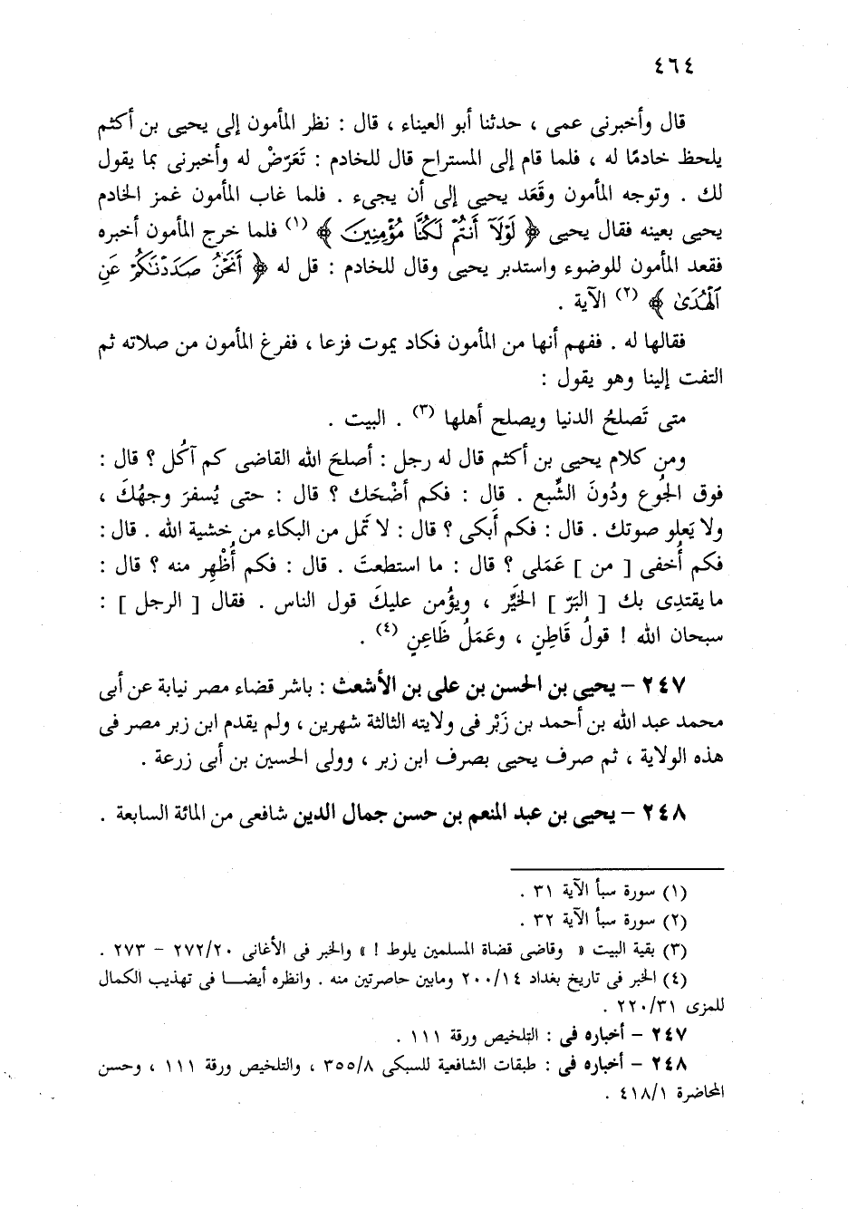 قال وأخبرني عمي، حدثنا أبو العيناء، قال: نظر المأمون إِلَى يحيى بن أكثم يلحظ خادماً لَهُ، فلما قام إِلَى المستراح قال للخادم: تَعَرّضْ لَهُ وأخبرني بما يقول لَكَ. وتوجه المأمون وقَعَد يحيى إِلَى أن يجيء. فلما غاب المأمون غمز الخادم يحيى بعينه فقال يحيى (لَوْلاَ أَنْتُمْ لَكُنّا مُؤْمِنِينَ) فلما خرج المأمون أخبره فقعد المأمون للوضوء واستدبر يحيى وقال للخادم: قال لَهُ (أَنَحْنُ صَدَدْنَاكُمْ عَنِ الْهُدَى) الآية.