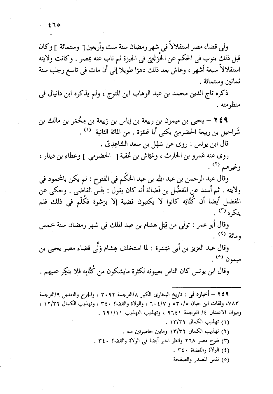 وقال عبد العزيز بن أبي مَيْسَرة: لما استخلف هِشام وَلَّى قضاء مصر يحيى بن ميمون.