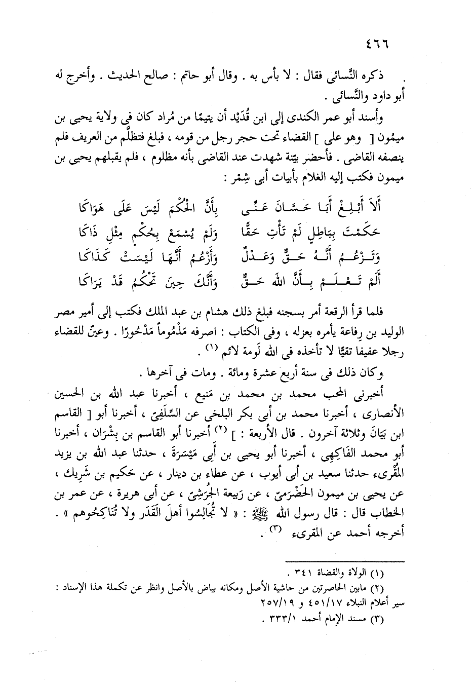 فلما قرأ الرقعة أمر بسجنه فبلغ ذَلِكَ هشام بن عبد الملك فكتب إِلَى أمير مصر الوليد بن رِفاعة يأمره بعزله، وَفِي الكتاب: اصرفه مَذْمُوماً مَدْحُوراً. وعيّن للقضاء رجلاً عفيفاً تقيّاً لا تأخذه فِي الله لَومة لائم.