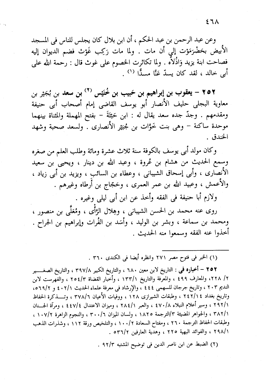 يعقوب بن إبراهيم بن حَبيب بن خُنَيْس بن سعد بن بُجَيْر بن معاوية البجلي حليف الأنصار أبو يوسف القاضي إمام أصحاب أبي حنيفة ومقدمهم. وجدّ جده يقال لَهُ: ابن حَبْتَةَ - بفتح المهملة والمثناة بينهما موحدة ساكنة - وهي بنت خَوَّات بن جُبَيْر الأنصاري. ولسعد صحبة وشهد الخندق.