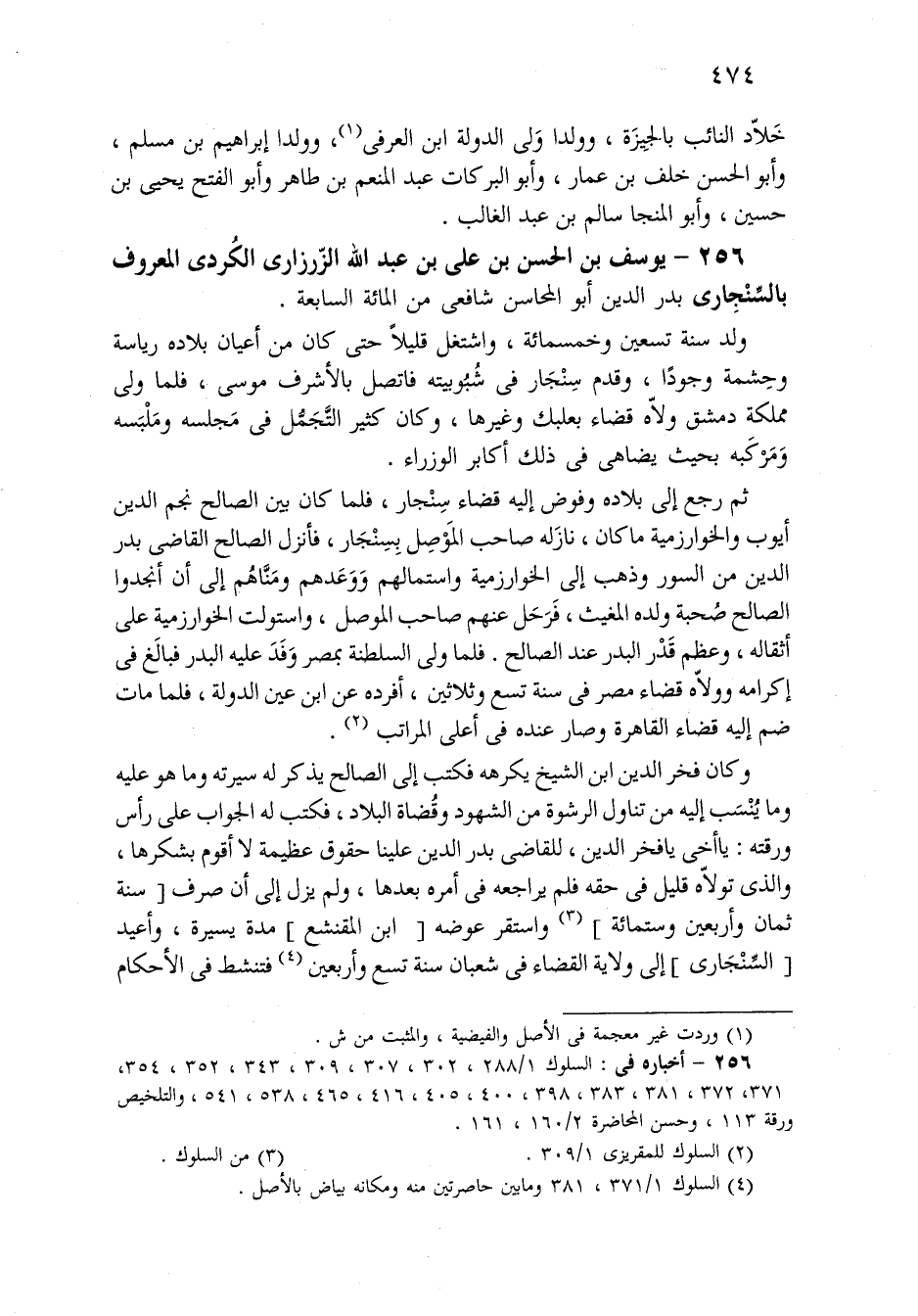 وكان فخر الدين ابن الشيخ يكرهه فكتب إِلَى الصالح يذكر لَهُ سيرته وَمَا هو عَلَيْهِ وَمَا يُنْسب إليه من تناول الرشوة من الشهود وقُضاة البلاد، فكتب لَهُ الجواب عَلَى رأس ورقته: يَا أخي يَا فخر الدين، للقاضي بدر الدين علينا حقوق عظيمة لا أقوم بشكرها، والذي تولاّه قليل فِي حقه فلم يراجعه فِي أمره بعدها، وَلَمْ يزل إِلَى أن صرف سنة ثمان وأربعين وستمائة واستقر عوضه ابن المقنشع مدة يسيرة، وأعيد السِّنْجَاري إِلَى ولاية القضاء فِي شعبان سنة تسع وأربعين فتنشط فِي الأحكام