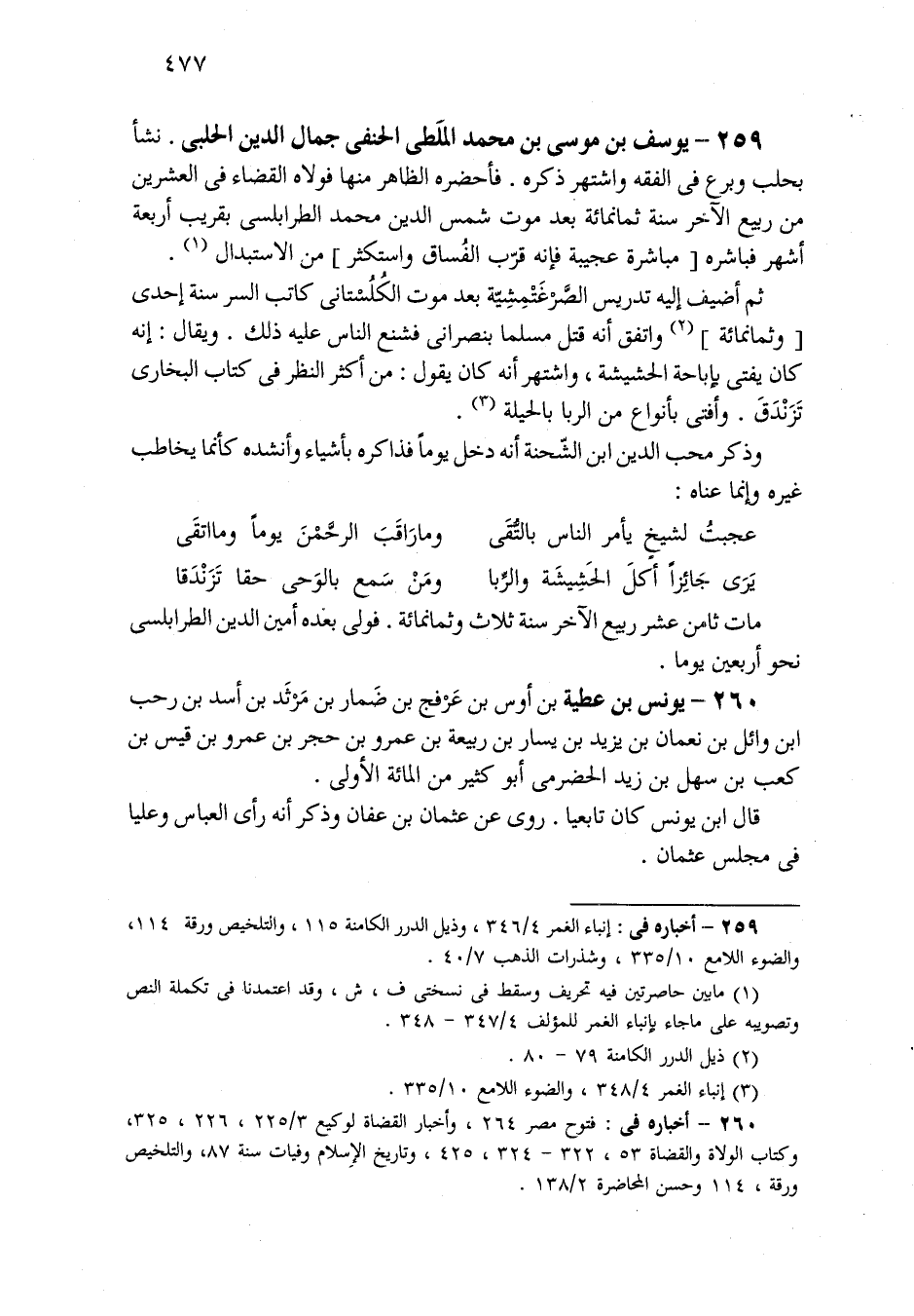 يوسف بن موسى بن محمد الملَطي الحنفي جمال الدين الحلبي. نشأ بحلب وبرع فِي الفقه واشتهر ذكره. فأحضره الظاهر منها فولاه القضاء فِي العشرين من ربيع الآخر سنة ثمانمائة بعد موت شمس الدين محمد الطرابلسي بقريب أربعة أشهر فباشره مباشرة عجيبة فإنه قرّب الفُساق واستكثر من الاستبدال.