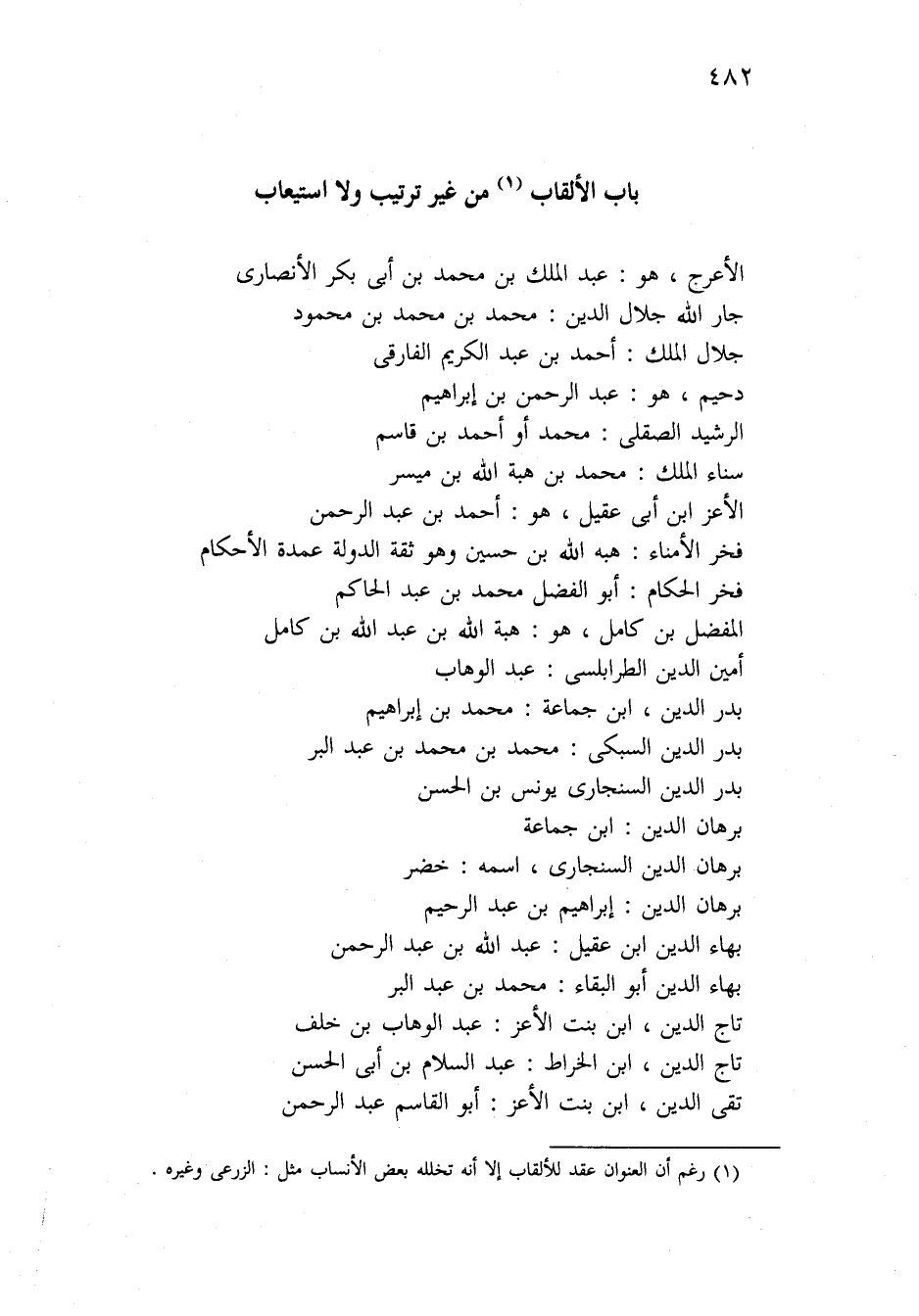 الأعرج، هو: عبد الملك بن محمد بن أبي بكر الأنصاري جار الله جلال الدين: محمد بن محمد بن محمود جلال الملك: أحمد بن عبد الكريم الفارقي دحيم، هو: عبد الرحمن بن إبراهيم الرشيد الصقلي: محمد أَوْ أحمد بن قاسم سناء الملك: محمد بن هبة الله بن ميسر الأعز ابن أبي عقيل، هو: أحمد بن عبد الرحمن فخر الأمناء: هبة الله بن حسين وهو ثقة الدولة عمدة الأحكام فخر الحكام: أبو الفضل محمد بن عبد الحاكم المفضل بن كامل، هو: هبة الله بن عبد الله بن كامل أمين الدين الطرابلسي: عبد الوهاب بدر الدين، ابن جماعة: محمد بن إبراهيم بدر الدين السبكي: محمد بن محمد بن عبد البر بدر الدين السنجاري يونس بن الحسن بران الدين: ابن جماعة برهان الدين السنجاري، اسمه: خضر برهان الدين: إبراهيم بن عبد الرحيم بهاء الدين ابن عقيل: عبد الله بن عبد الرحمن بهاء الدين أبو البقاء: محمد بن عبد البر تاج الدين: ابن بنت الأعز: عبد الوهاب بن خلف تاج الدين، ابن الخراط: عبد السلام بن أبي الحسن تقي الدين، ابن بنت الأعز: أبو القاسم عبد الرحمن