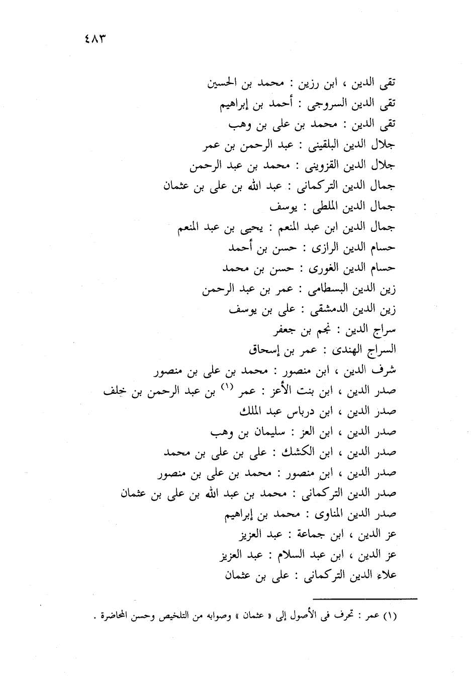 تقي الدين، ابن رزين: محمد بن الحسين تقي الدين السروجي: أحمد بن إبراهيم تقي الدين: محمد بن علي بن وهب جلال الدين البلقيني: عبد الرحمن بن عمر جلال الدين القزويني: محمد بن عبد الرحمن جمال الدين التركماني: عبد الله بن علي بن عثمان جمال الدين الملطي: يوسف جمال الدين ابن عد المنعم: يحيى بن عبد المنعم حسام الدين الرازي: حسن بن أحمد حسام الدين الغوري: حسن بن محمد زين الدين البسطامي: عمر بن عبد الرحمن زين الدين الدمشقي: علي بن يوسف سراج الدين: نجم بن جعفر السراج الهندي: عمر بن إسحاق شرف الدين، ابن منصور: محمد بن علي بن منصور صدر الدين، ابن بنت الأعز: عمر نب عبد الرحمن بن خلف صدر الدين، ابن درباس عبد الملك صدر الدين، ابن العز: سليمان بن وهب صدر الدين، ابن الكشك: علي بن علي بن محمد صدر الدين، ابن منصور: محمد بن علي بن منصور صدر الدين التركماني: محمد بن عبد الله بن علي بن عثمان صدر الدين المناوي: محمد بن إبراهيم هز الدين، ابن جماعة: عبد العزيز عز الدين، ابن عبد السلام: عبد العزيز علاء الدين التركماني: علي بن