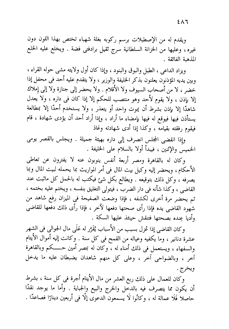 وكان للعمال عَلَى ذَلِكَ ربع العشر من مال الأيتام أجرة فِي كل سنة، بشرط أن يكون مما يتصرف فِيهِ بالدخل والخرج والبيع والجباية. وأما مَا يوجد نقداً حاصلاً فلاَ عمالة لَهُ، وكانُوا لاَ يسمعون الدعوى إِلاَّ فِي أربعين ديناراً فصاعداً.