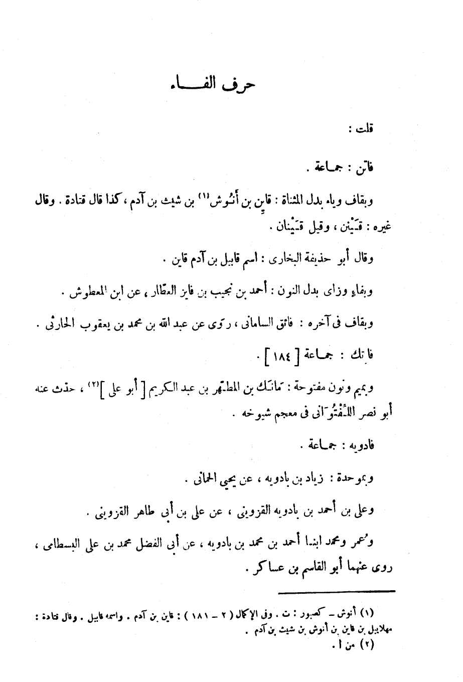 وبقاف وياء بدل المثناة: قاين بن أنوش بن شيث بن آدم، كذا قال قتادة، وقال غيره: قينن، وقِيل: قينان.
