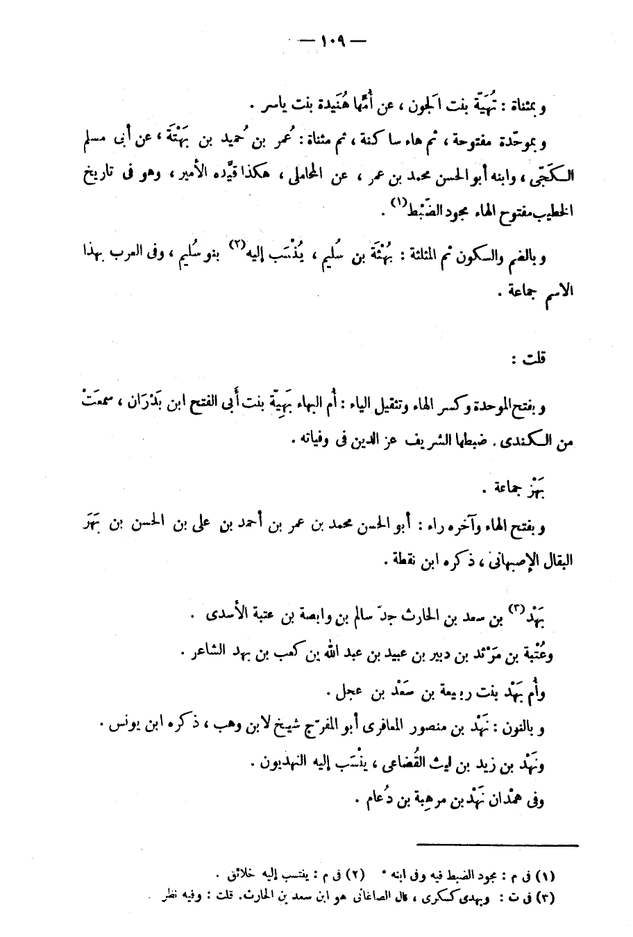 وبموحّدة مفتوحة، ثم هاء ساكنة، ثم مثناة: عُمر بن حُميد بن بَهْتَة، عن أبي مسلم الكَجّي، وابنه أبو الحسن محمد بن عمر، عن المحاملي، هكذا قيَّده الأمير، وهو في تاريخ الخطيب مفتوح الهاء مجود الضَّبْط.