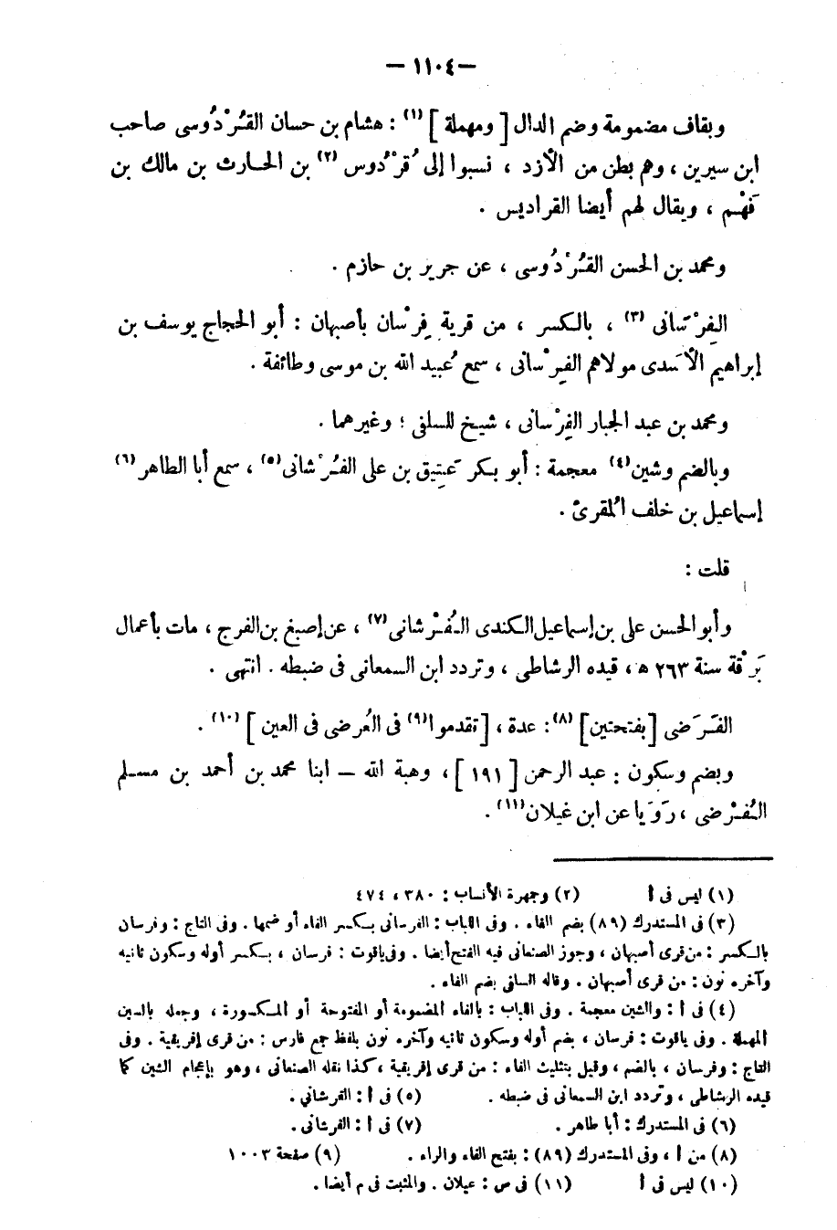 الفرساني، بالكسر، من قرية فرسان بأصبهان: أبو الحجاج يوسف بن إبراهيم الأسدي مولاهم الفرساني، سمع عبيد الله بن موسى وطائفة.
