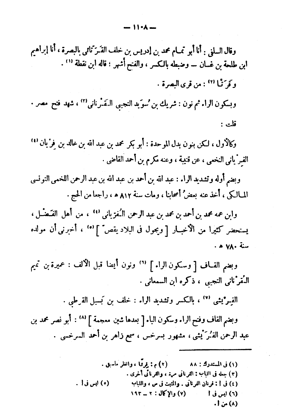 وبضم القاف وسكون الراء ونون أيضاً قبل الألف: عميرة بن تميم القرناني التجيبي، ذكره ابن السمعاني.