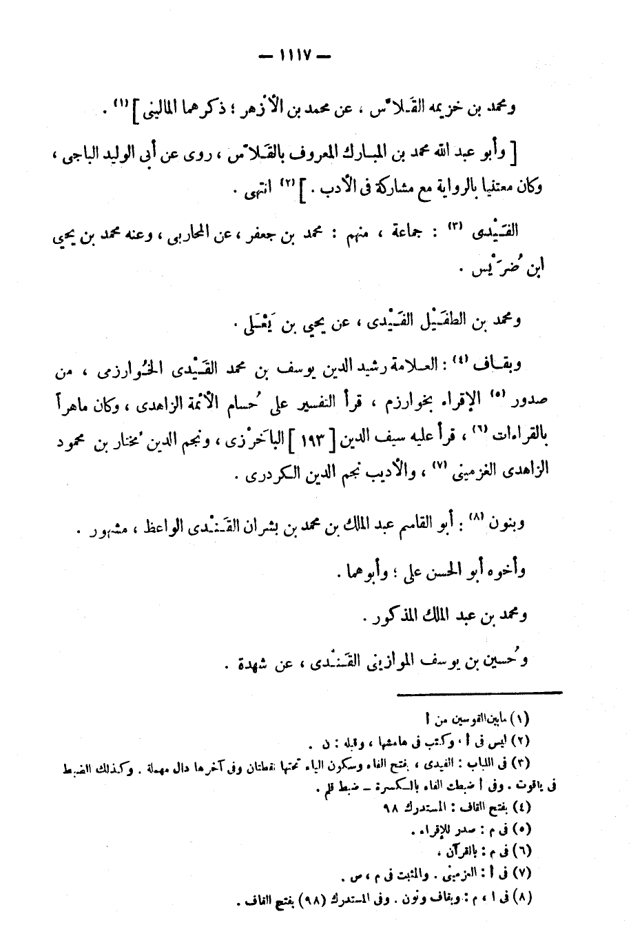 وبقاف: العلامة رشيد الدين يوسف بن محمد القيدي الخوارزمي، من صدور الإقراء بخوارزم، قرأ التفسير على حسام الأئمة الزاهدي، وكان ماهراً بالقراءات، قرأ عليه سيف الدين الباخرزي، ونجم الدين مختار بن محمود الزاهدي الغزميني، والأديب نجم الدين الكردي.